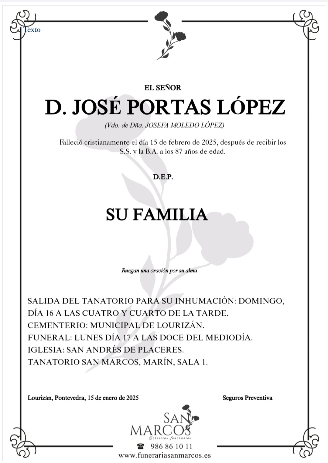 La funeraria SAN MARCOS comunica el fallecimiento HOY día 15 de febrero, de Don JOSÉ PORTAS LÓPEZ cuyos restos mortales permanecerán en el Tanatorio San Marcos, de Marín, hasta el momento de su traslado, MAÑANA DOMINGO día 16, a las cuatro y cuarto de la tarde para su inhumación en el Cementerio Municipal de Lourizán. D.E.P.
