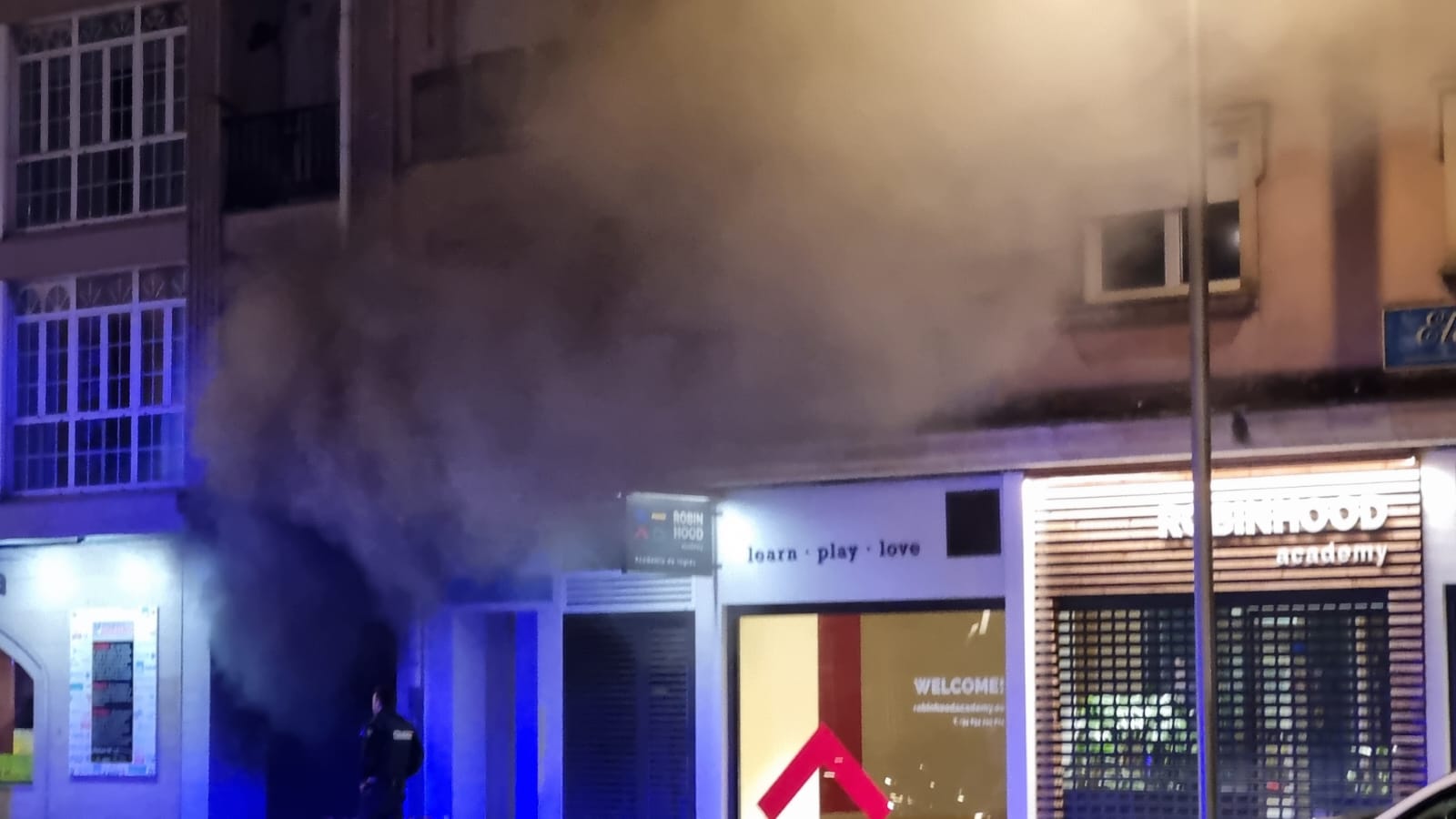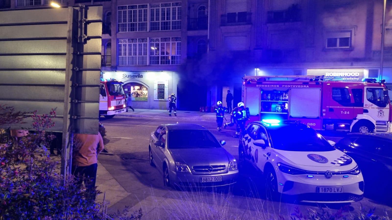 Dos dotaciones de bomberos de Pontevedra y otras dos del Morrazo tratan de extinguir el incendio de, al menos un vehículo en el garaje del edificio número 47 de la Avenida de Orense.