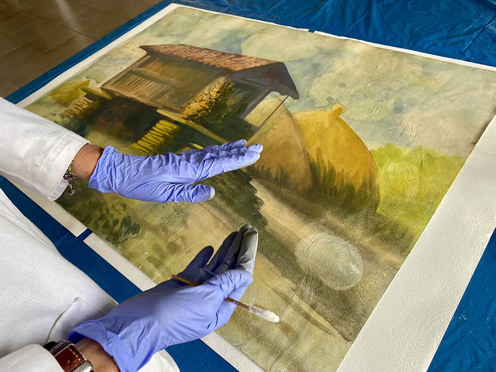 Eva Fontoria es la restauradora que con tanto éxito recuperó la obra del Portico da Gloria, de Villafinez y cuenta con la confianza del gobierno local de Marín para este segundo trabajo que ayer visitó la concejala Itziar Álvarez. La técnica explicó que se trata de una acuarela de los fondos del Museo que es uno de los pocos cuadros de Torres sobre la temática de los hórreos e indicó “Este cadro presentaba unha importante deformación do soporte debido a un exceso de humidade. De feito, hai unha marca moi visible dunha gota de auga que comeu a cor, e hai presenza de pregues e de enrugas, que están a ser corrixidas. A maiores, apareceron manchas de humidade e os pigmentos dalgunhas cores están decolorados”,