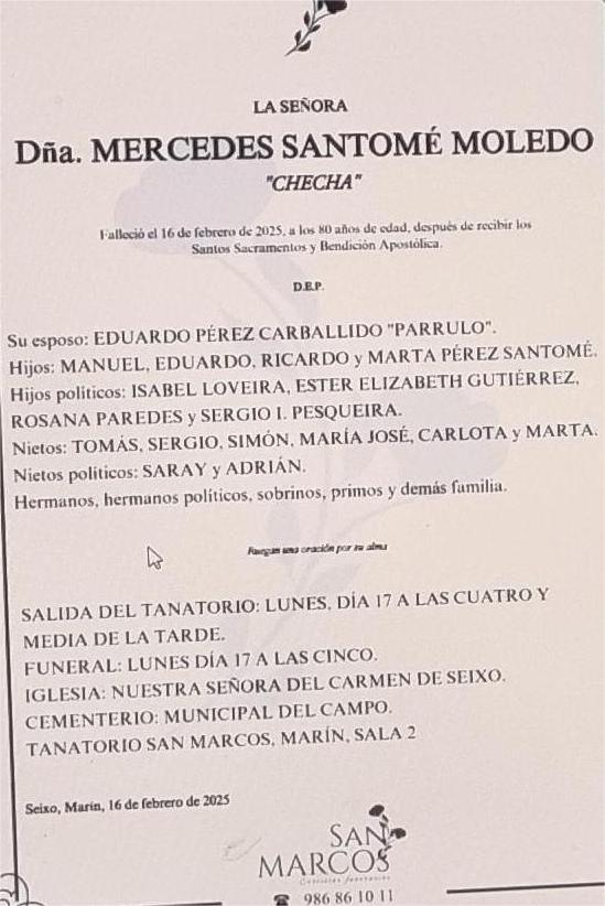 La funeraria SAN MARCOS comunica el fallecimiento ayer día 16 de febrero, de Doña MERCEDES SANTOMÉ MOLEDO cuyos restos mortales permanecerán en el Tanatorio San Marcos, de Marín, sala número 2 hasta el momento de su traslado, HOY LUNES día 17, a las cuatro y media de la tarde para su inhumación en el Cementerio Municipal del Campo. D.E.P.