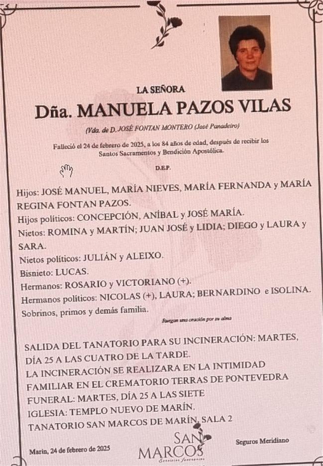 La funeraria SAN MARCOS comunica el fallecimiento hoy día 24 de febrero, de Doña MANUELA PAZOS VILAS cuyos restos mortales permanecerán en el Tanatorio San Marcos, de Marín, sala número 2, hasta el momento de su traslado, mañana martes día 25, a las cuatro de la tarde para su incineración en el crematorio “Terras de Pontevedra” en la intimidad familiar.