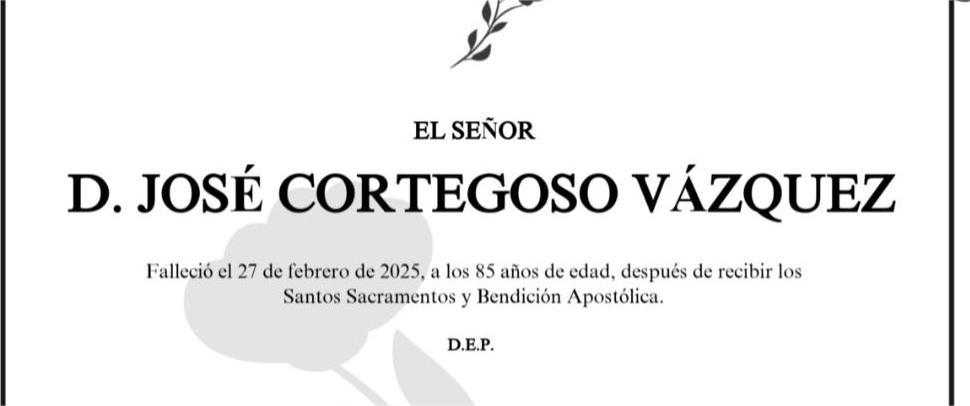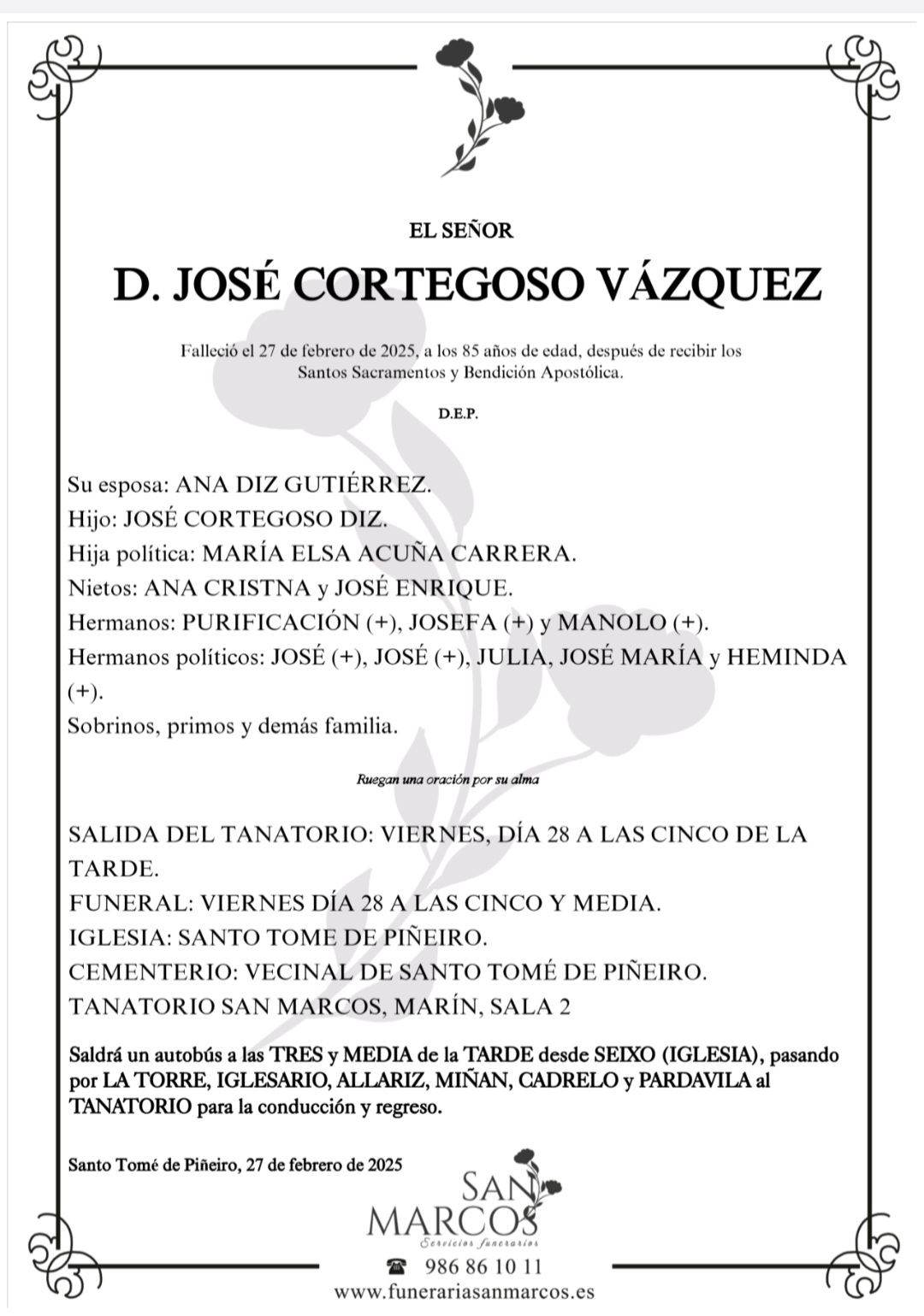 La funeraria SAN MARCOS comunica el fallecimiento, hoy día 27, de Don JOSÉ CORTEGOSO VÁZQUEZ cuyos restos mortales permanecerán en su Tanatorio de Marín, sala número 2, hasta el momento de su traslado, mañana viernes día 28 a las cinco de la tarde al cementerio vecinal de Santo Tomé de Piñeiro para su inhumación.