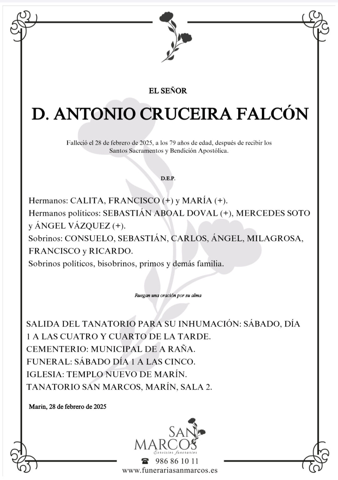 La funeraria SAN MARCOS comunica el fallecimiento, hoy día 28, de Don ANTONIO CRUCEIRA FALCÓN cuyos restos mortales permanecerán en su Tanatorio de Marín, sala nº 2 hasta el momento de su traslado, mañana sábado día 1 de marzo a las cuatro y cuarto de la tarde al cementerio municipal de A Raña para su inhumación.