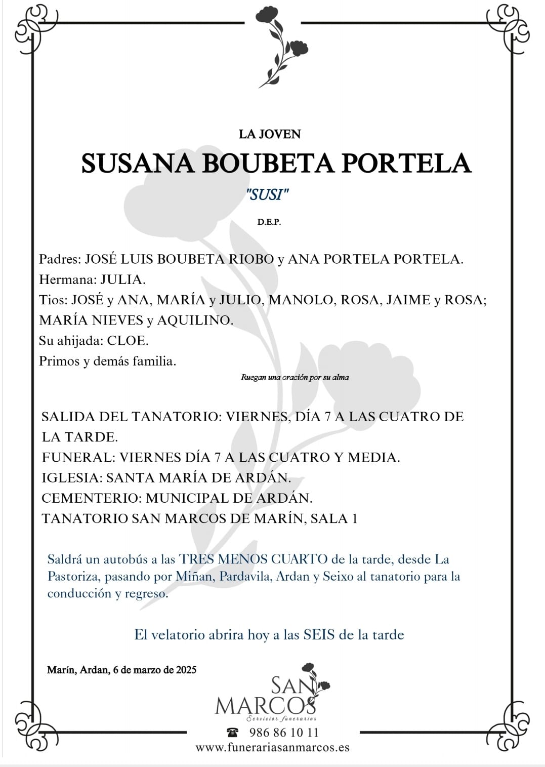La funeraria SAN MARCOS comunica el fallecimiento de la joven SUSANA BOUBETA PORTELA cuyos restos mortales permanecerán en su Tanatorio de Marín, sala nº 1 hasta el momento de su traslado, mañana viernes día 7 de marzo a las cuatro de la tarde al cementerio municipal de Ardán para su inhumación.
