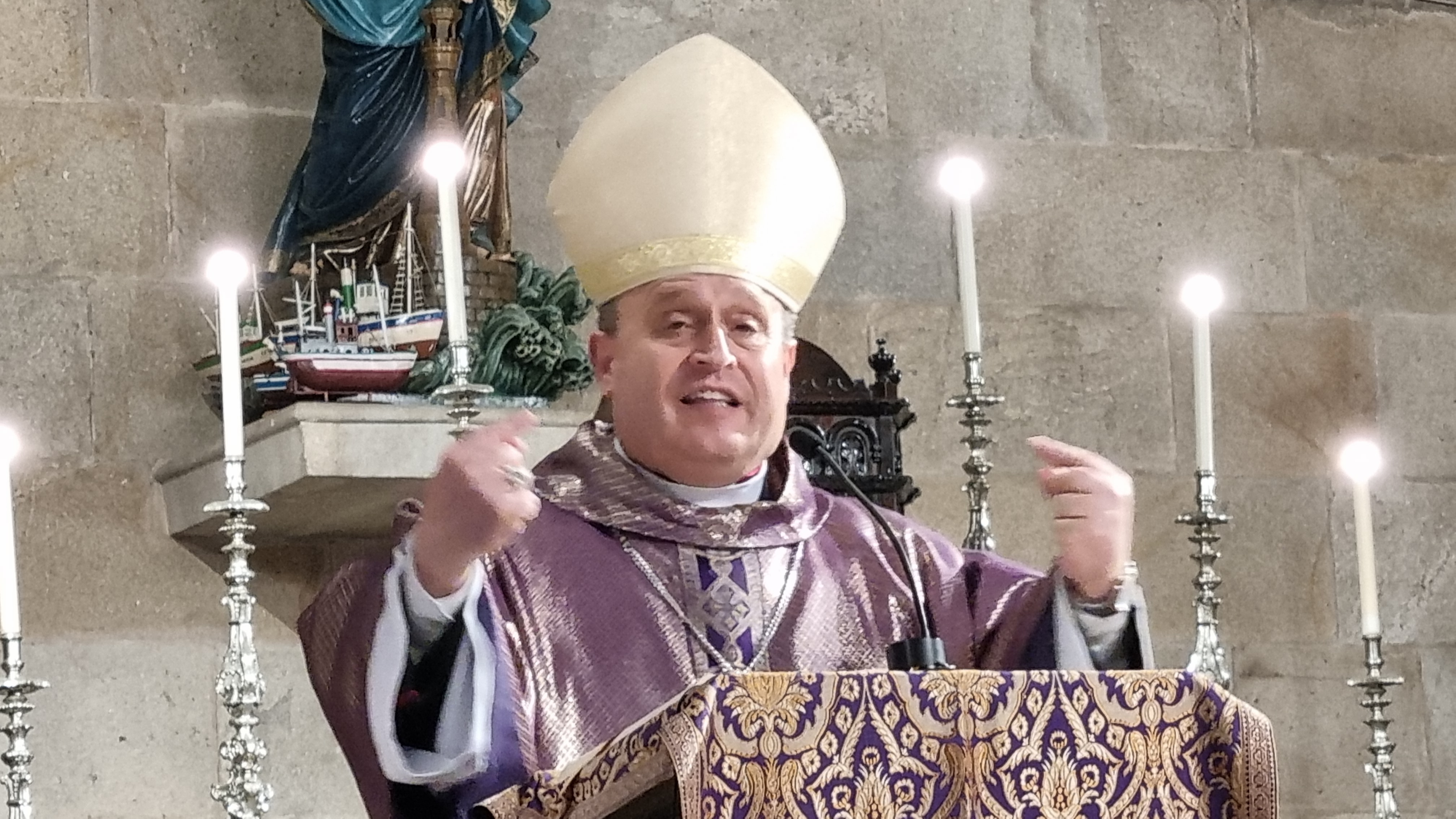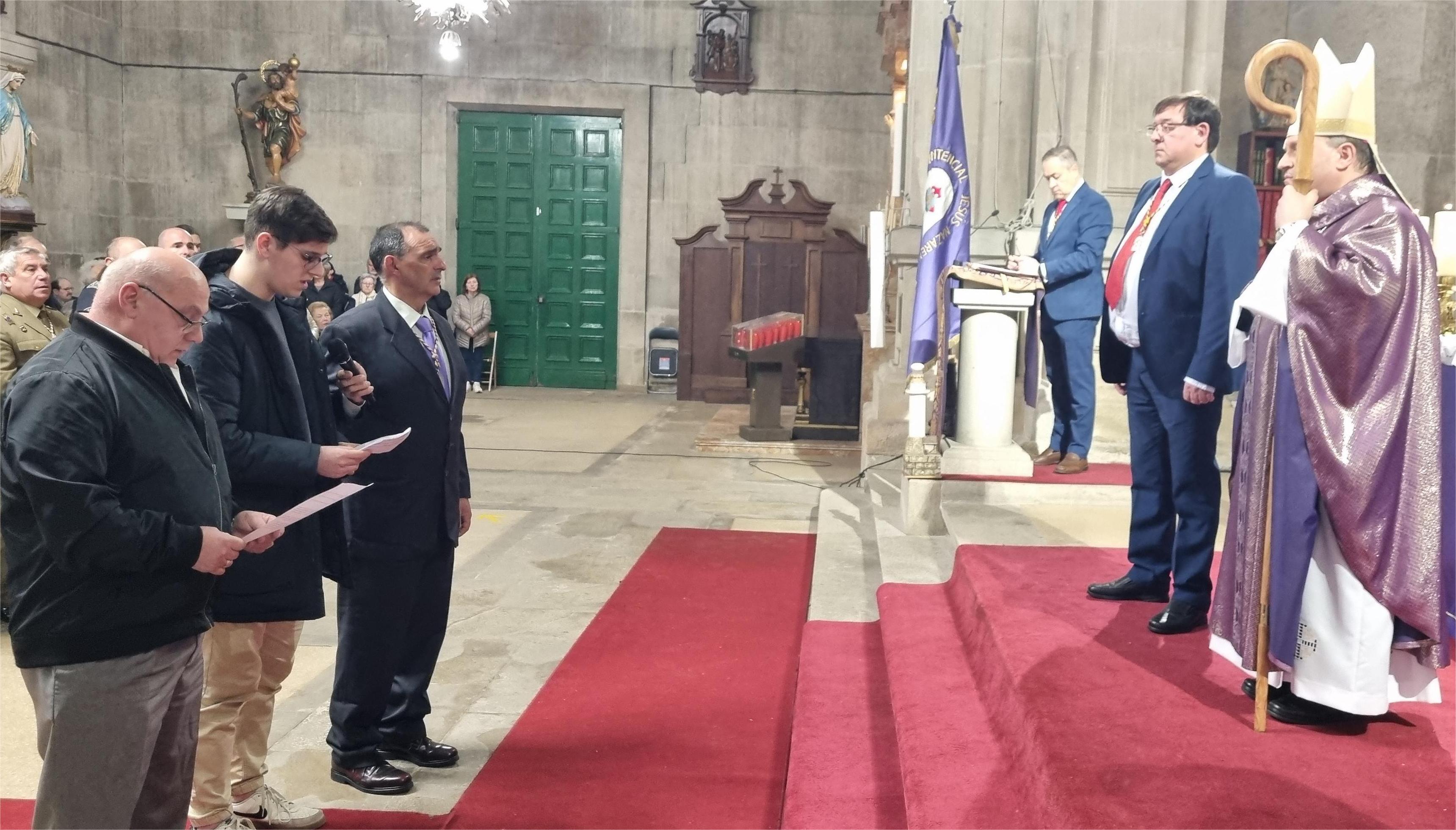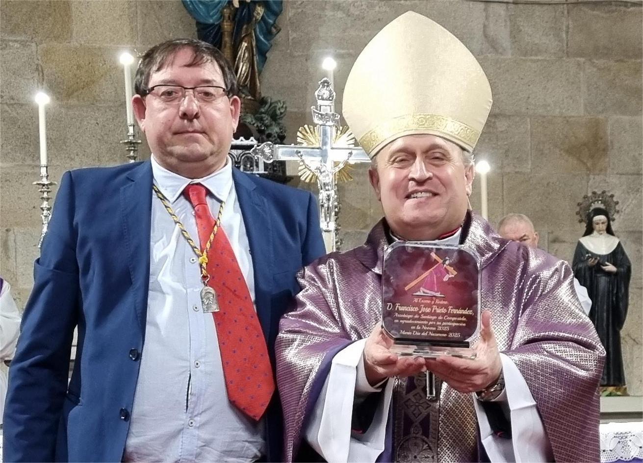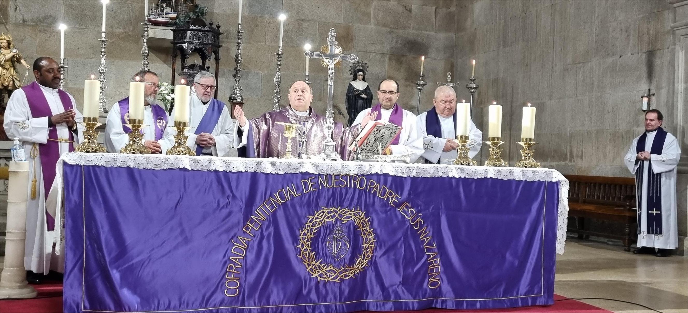 homilía poniendo el acento en el camino del Nazareno hacia la Cruz de su muerte que es, dijo, un camino de vida y esperanza para todos nosotros. Prieto Fernández dedicó palabras especialmente dirigidas a los miembros de la cofradía a los que recordó que pertenecer a un grupo como ese significa algo más que estar inscrito en una lista y es, sin embargo, un motivo de compromiso con la atención a todo lo que rodea a cada persona procurando atender a sus necesidades de todo tipo y con ello seguir la estela del Nazareno que en definitiva es la misión de la cofradía y sus componentes.