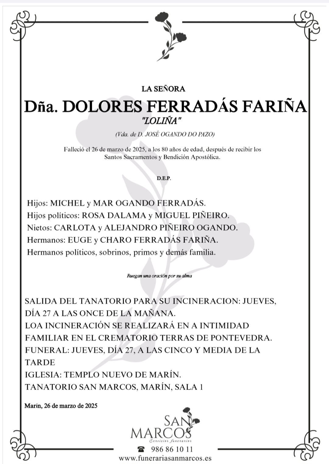 La funeraria SAN MARCOS comunica el fallecimiento HOY día 26, de doña DOLORES FERRADÁS FARIÑA cuyos restos mortales permanecerán en el Tanatorio SAN MARCOS, de Marín, sala nº1 hasta el momento de su traslado, mañana JUEVES día 27 de marzo a las ONCE de la mañana desde el tanatorio al crematorio Terras de Pontevedra para su incineración en la intimidad familiar