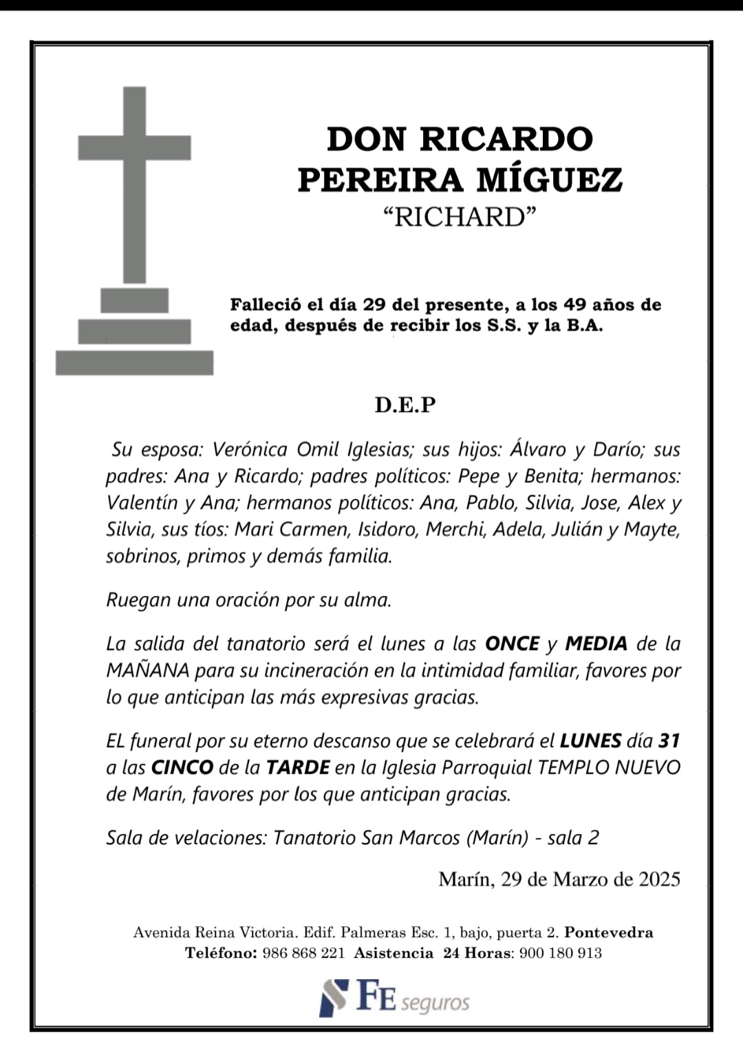La funeraria LA FE comunica el fallecimiento HOY día 29, a los 49 años de edad de RICARDO PEREIRA MÍGUEZ cuyos restos mortales permanecerán en el Tanatorio SAN MARCOS, de Marín, sala nº2 hasta el momento de su traslado, el lunes día 31 de marzo a las ONCE Y MEDIA de la mañana desde el tanatorio al crematorio para su incineración en la intimidad familiar