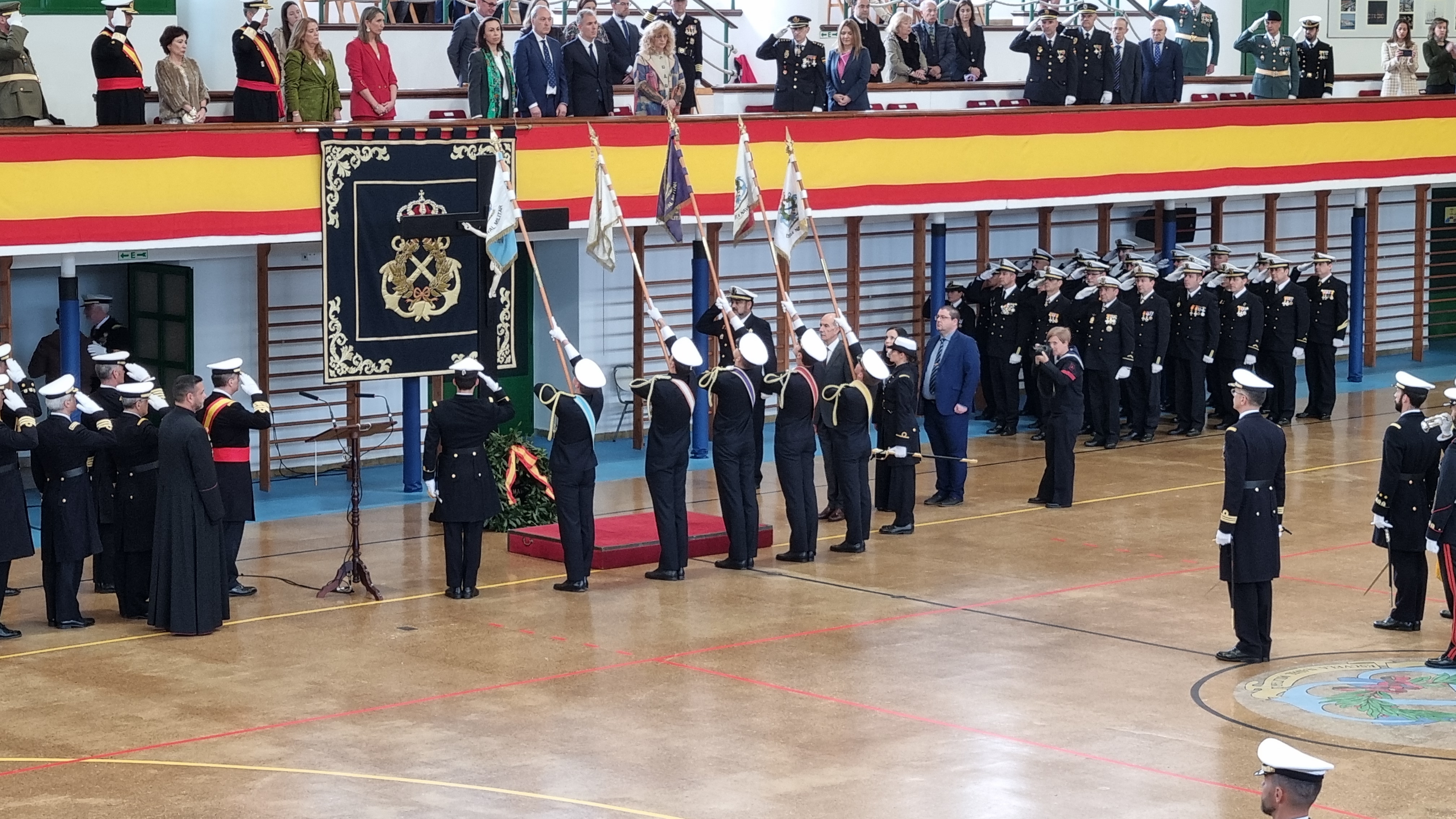 La amenaza de lluvia aconsejó la celebración de la Jura de Bandera de los Aspirantes a Oficiales Reservistas de la Armada en el pabellón de deportes lo que no restó brillantez al acto en el que participaron las diferentes brigadas de alumnos y guardiamarinas del centro junto con un grupo de los “IMECAR” que hace cuarenta años estuvieron en la Escuela Naval y que procedieron a renovar su compromiso con la Enseña Nacional y su significado.