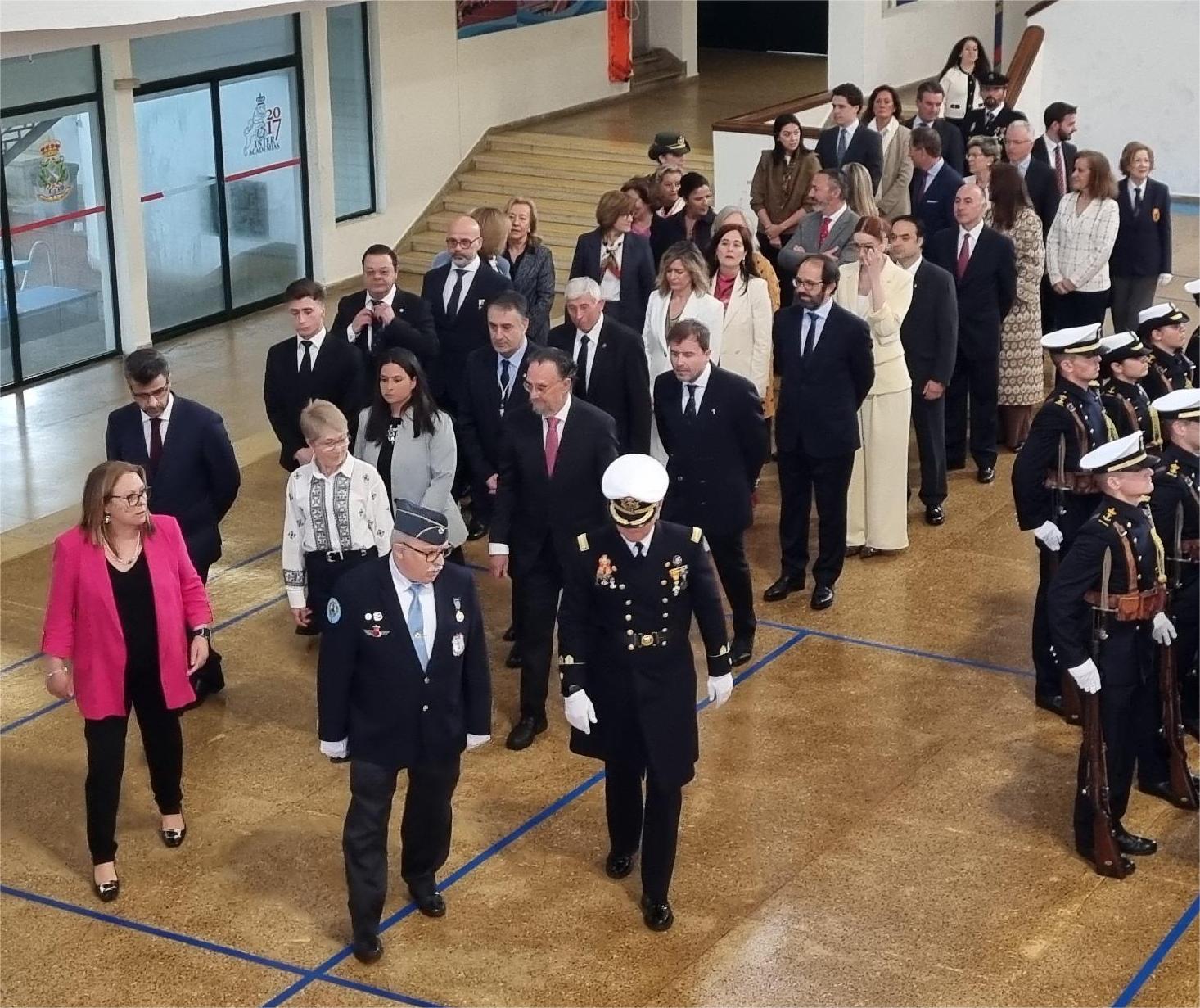 El acto estuvo presidido por el Almirante Jefe del Arsenal de Ferrol, Gonzalo Villar Rodríguez que, a su llegada al recinto, fue recibido por el comandante director de la Escuela, Capitán de Navío Cardona Suanzes que le acompañó en el protocolario acto de revista a la fuerza formada en el recinto tras lo cual dio comienzo el programa establecido con el juramento de los aspirantes Reservistas que contaban entre ellos con la presencia del que fuera hace cuatro décadas, comandante de su brigada y hoy es el General de División y Director General de Personal del Ministerio de Defensa, José Ramón Velón. Los reservistas pasaron de uno en uno besando la Enseña Nacional y, posteriormente, bajo ella