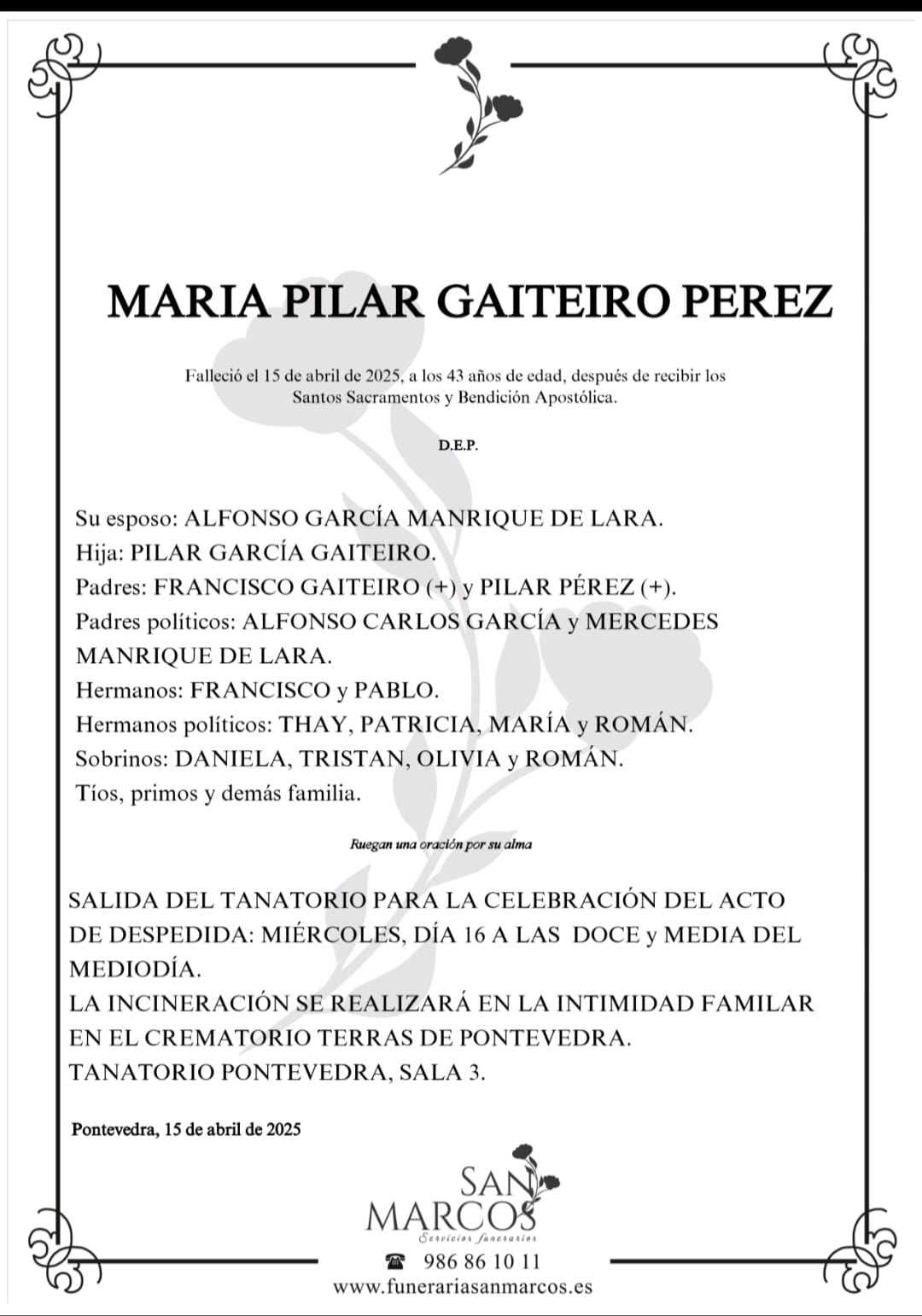 Los restos mortales de la profesora se encuentran en el tanatorio San Marcos de Pontevedra, sala número 3 donde tendrá lugar el acto de despedida mañana miércoles a las doce y media del mediodía previo a su incineración en el crematorio “Terras de Pontevedra”. Descanse en paz y sea la mayor resignación con sus familiares, especialmente esposo e hija.