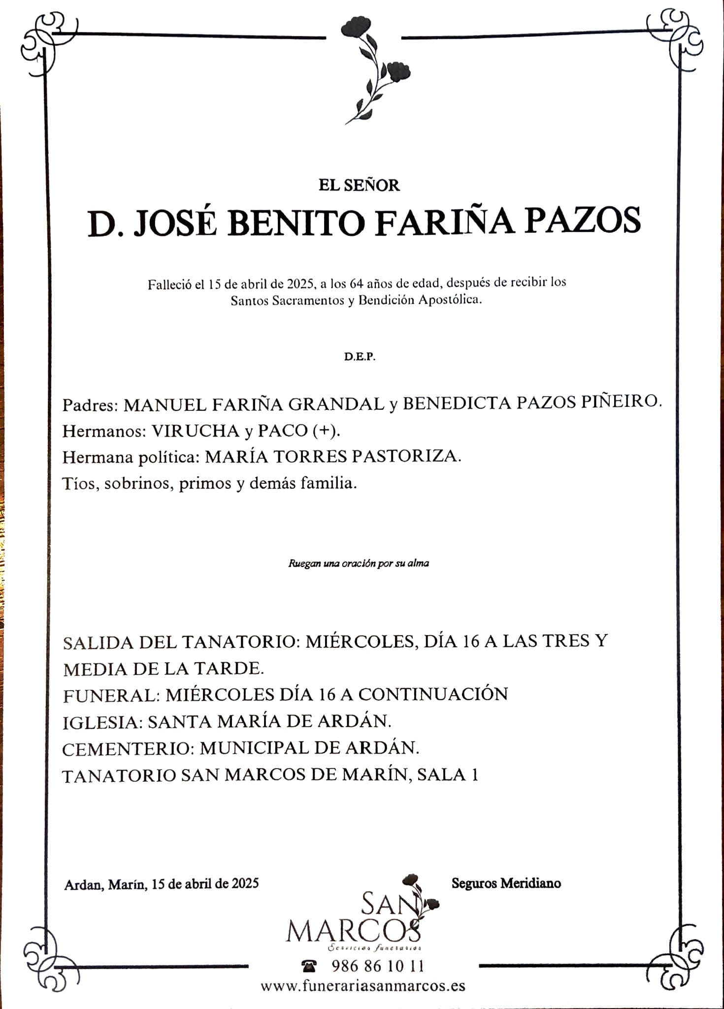La funeraria SAN MARCOS comunica el fallecimiento ayer 15, de abril de Don JOSÉ BENITO FARIÑA PAZOS cuyos restos mortales permanecerán en el Tanatorio SAN MARCOS, de Marín, SALA NÚMERO 1, hasta el momento de su traslado, HOY MIÉRCOLES día 16 de abril a las TRES Y MEDIA de la tarde para su inhumación en el cementerio municipal de Ardán.
