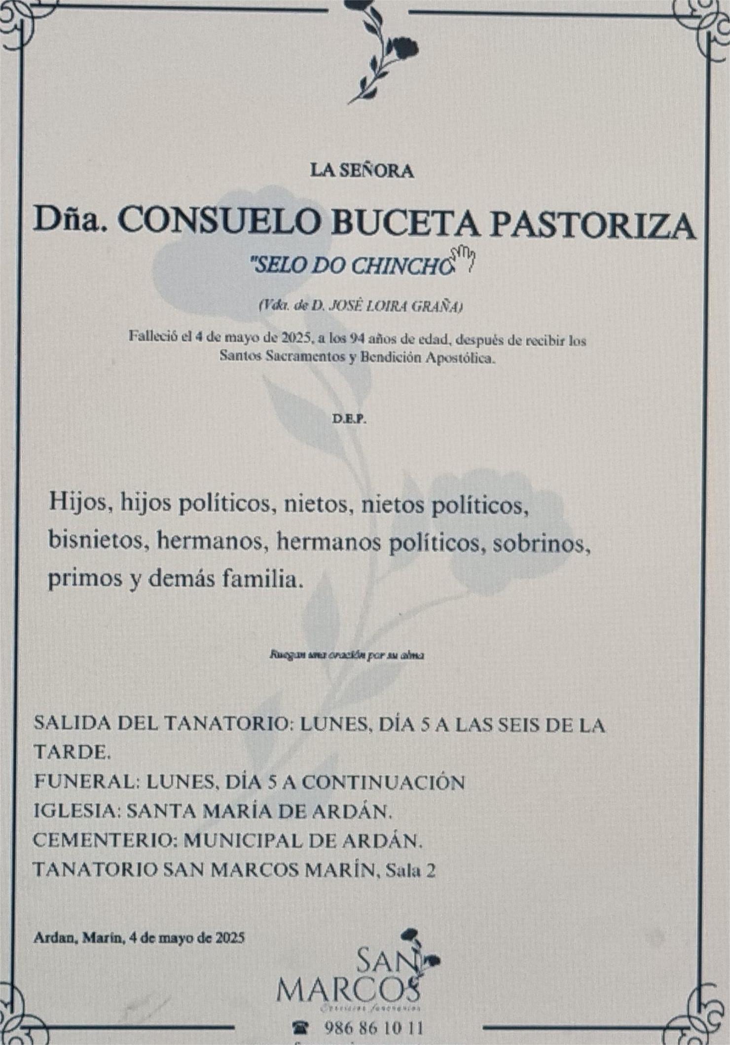 La funeraria SAN MARCOS comunica el fallecimiento hoy día 4 de mayo de Dña. CONSUELO BUCETA PASTORIZA cuyos restos mortales permanecerán en el Tanatorio SAN MARCOS, de Marín, sala número 2 hasta el momento de su traslado, MAÑANA LUNES día 5 de mayo a las seis de la tarde para su inhumacióm en el cementerio municipal de Ardán .