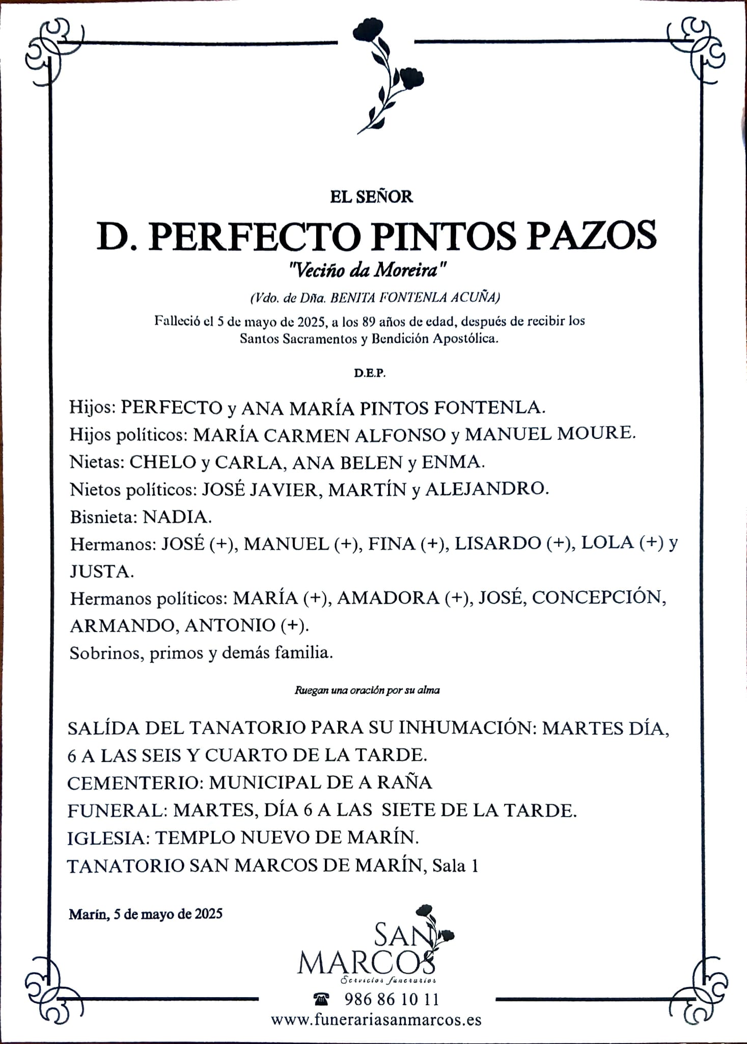 La funeraria SAN MARCOS comunica el fallecimiento hoy día 5 de mayo de Don. PERFECTO PINTOS PAZOS cuyos restos mortales permanecerán en el Tanatorio SAN MARCOS, de Marín, sala número 1 hasta el momento de su traslado, MAÑANA MARTES día 6 de mayo a las SEIS Y CUARTO de la tarde para su inhumacióm en el cementerio municipal de A Raña .