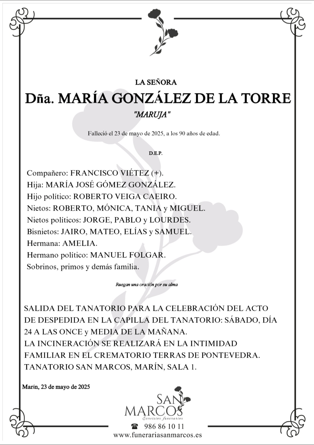 La funeraria SAN MARCOS comunica el fallecimiento HOY día 23 de mayo de doña MARÍA GONZÁLEZ DE LA TORRE cuyos restos mortales permanecerán en el Tanatorio SAN MARCOS, de Marín, sala número 1 hasta el momento de su traslado, MAÑANA SÁBADO día 24 de mayo a las ONCE Y MEDIA de la mañana para su incineración en el crematorio Terras de Pontevedra en la intimidad familiar.
