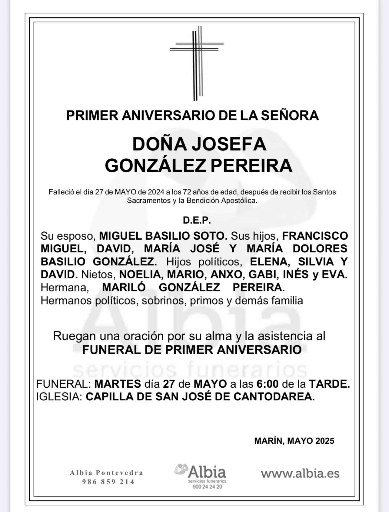 La familia de Doña JOSEFA GONZÁLEZ PEREIRA, fallecida el 27 de mayo del año pasado, 2024, comunica que esta tarde, a las SEIS tendrá lugar la misa funeral de aniversario por alma en la iglesia parroquial de San José de Cantodarea rogando la asistencia al acto y una oración en su recuerdo favores por los que anticipan gracias.