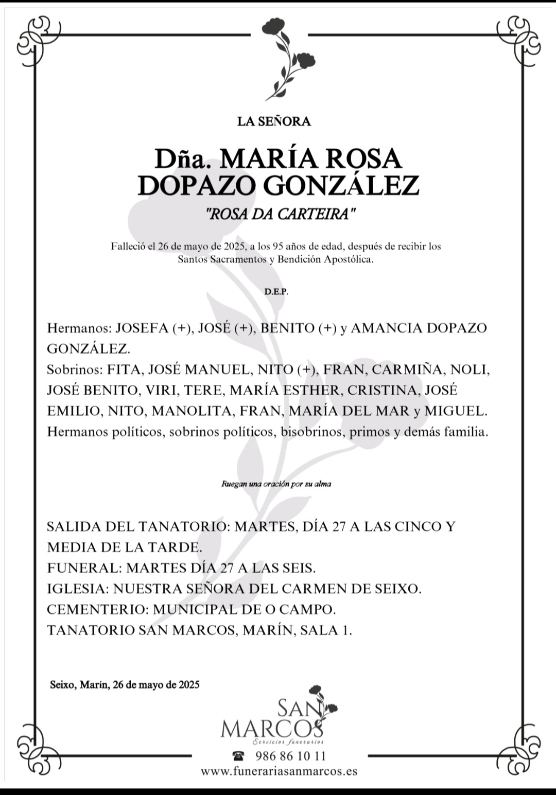 La funeraria SAN MARCOS comunica el fallecimiento HOY día 26 de mayo de doña María Rosa Dopazo González cuyos restos mortales permanecerán en el Tanatorio SAN MARCOS, de Marín, sala número 1, hasta el momento de su traslado, MAÑANA MARTES día 27 de mayo a las CINCO Y MEDIA de la tarde para su inhumación en el Cementerio Municipal de O Campo.