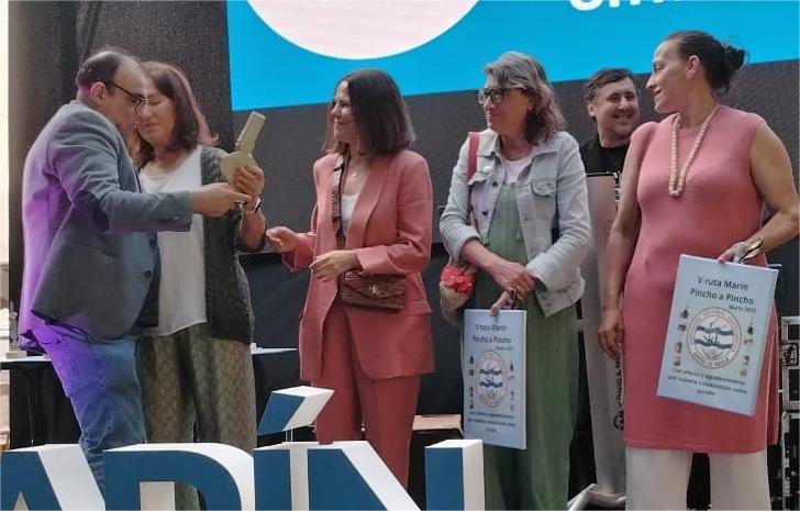 El primer premio de la “V Ruta Marín Pincho a Pincho” fue para “Perlas da Meiga”, pincho ofrecido por la cafetería Costrumar cuya representante recibió de manos del presidente de “Botón de Ancla”, Manuel Area,el galardón consistente en el premio propiamente dicho y un viaje.