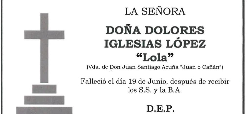La funeraria LA FE comunica el fallecimiento hoy, día 19 de junio, de doña DOLORES IGLESIAS LÓPEZ, cuyos restos mortales permanecerán en el Tanatorio SAN MARCOS, de Marín, sala nº 1, hasta el momento de su traslado, mañana viernes día 20 de junio a las once y media de la mañana al cementerio municipal de A Raña para su inhumación..