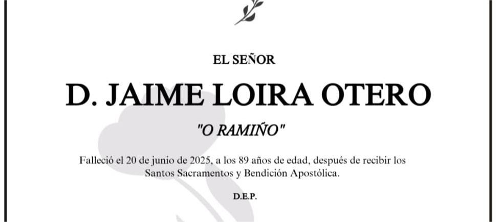 La funeraria SAN MARCOS comunica el fallecimiento hoy, día 20 de junio, de don JAIME LOIRA OTERO, cuyos restos mortales permanecerán en el Tanatorio SAN MARCOS, de Marín, sala nº 2, hasta el momento de su traslado, mañana sábado día 21 de junio a las doce del mediodía al crematorio “Terras de Pontevedra” para su incineración en la intimidad familiar.