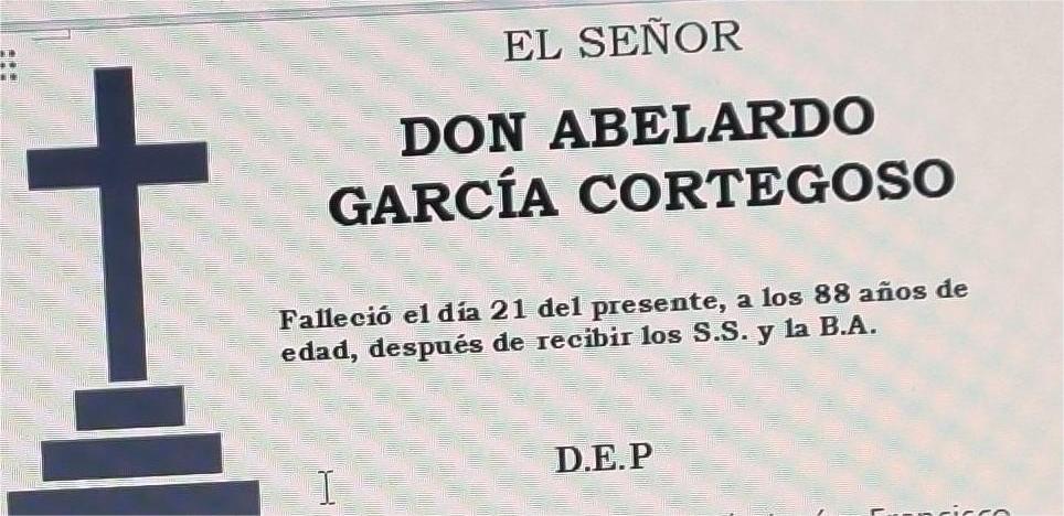 La funeraria SAN MARCOS comunica el fallecimiento hoy, día 21 de junio, de don ABELARDO GARCÍA CORTEGOSO, cuyos restos mortales permanecerán en el Tanatorio SAN MARCOS, de Marín, sala nº 2, hasta el momento de su traslado, mañana DOMINGO día 22 de junio, a las DIEZ de la mañana, al cementerio municipal de Lourizán para su inhumación .