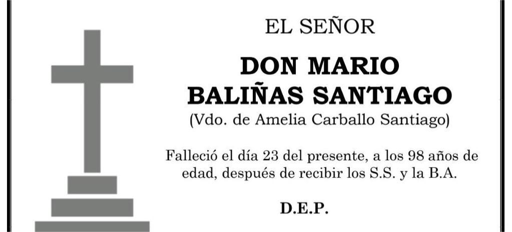 La funeraria LA FE comunica el fallecimiento AYER, día 23 de junio, de don MARIO BALIÑAS SANTIAGO cuyos restos mortales permanecerán en el Tanatorio SAN MARCOS, de Marín, sala nº 2, hasta el momento de su traslado, HOY martes día 24 de junio, a las CINCO de la tarde, para su incineración en la intimidad familiar .