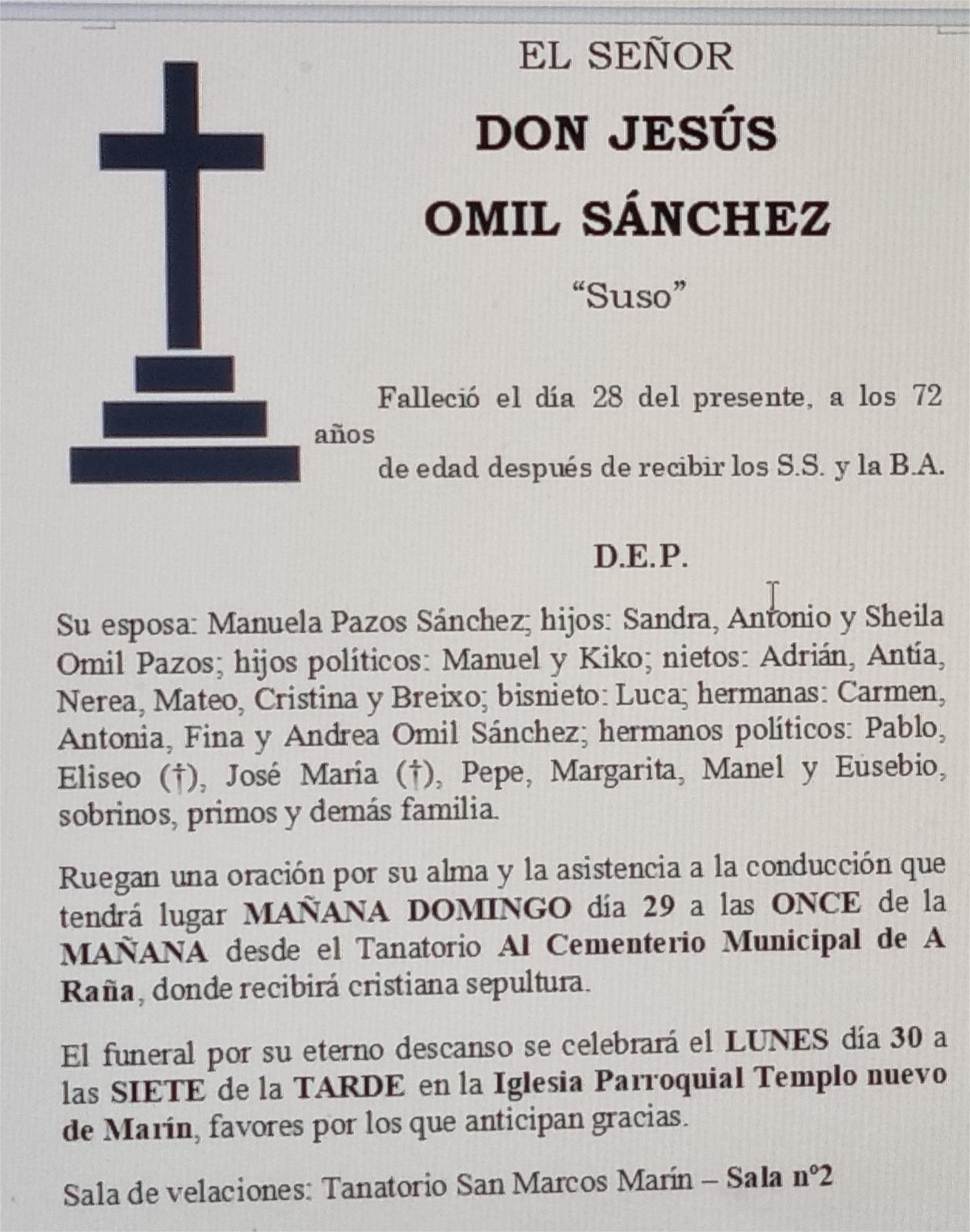 La funeraria LA FE comunica el fallecimiento hoy, día 28 de junio, de don JESÚS OMIL SÁNCHEZ cuyos restos mortales permanecerán en el Tanatorio SAN MARCOS, de Marín, sala nº 2, hasta el momento de su traslado, MAÑANA domingo día 29 de junio, a las once de la mañana, para su inhumación en el cementerio municipal de A Raña .