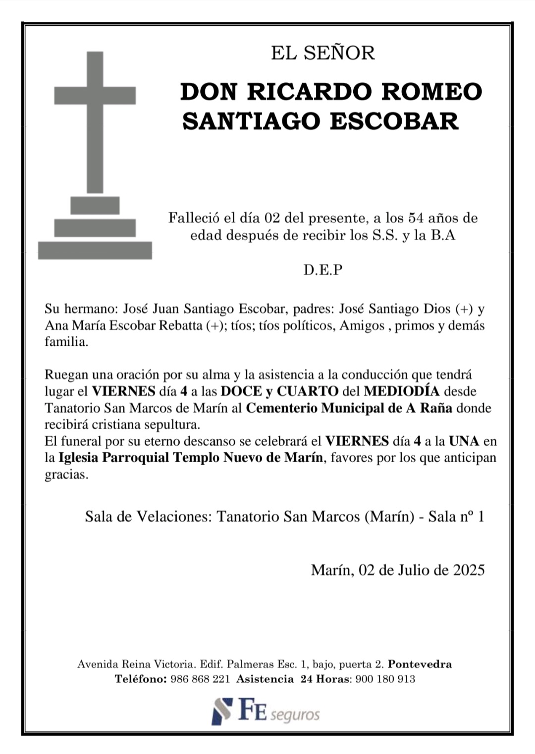 La funeraria LA FE comunica el fallecimiento hoy, día 02 de julio, de don RICARDO ROMEO SANTIAGO ESCOBAR cuyos restos mortales permanecerán en el Tanatorio SAN MARCOS, de Marín, sala nº 1, hasta el momento de su traslado, el próximo viernes, día 4 de julio, a las doce y cuarto del mediodía, para su inhumación en el cementerio municipal de A Raña .