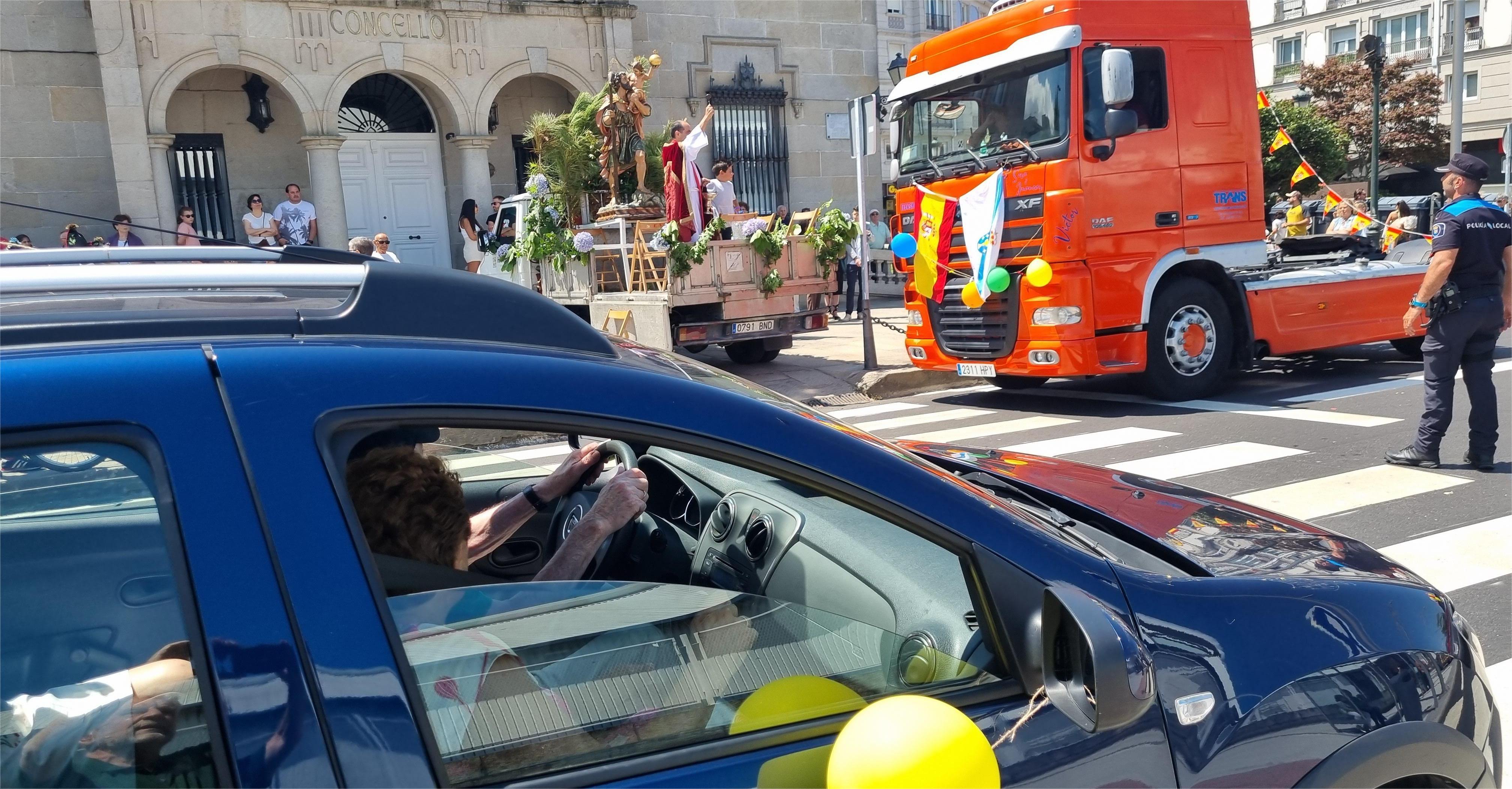 La jornada dedicada a San Cristóbal reunió a numerosos vehículos muchos de ellos adornados en una procesión a cuyo paso por la Avenida de Ourense, ante el Concello, recibieron la tradicional bendición