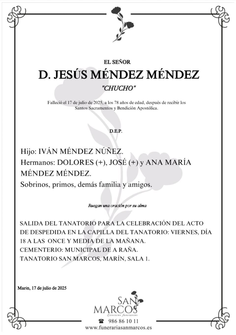 Ayer dábamos la mala noticia del fallecimiento de “Chucho Méndez” una persona muy conocida y apreciada en Marín que desaparece repentinamente dejando una marcada huella de sentimiento entre sus familiares y amigos que le tenían en gran estima.
