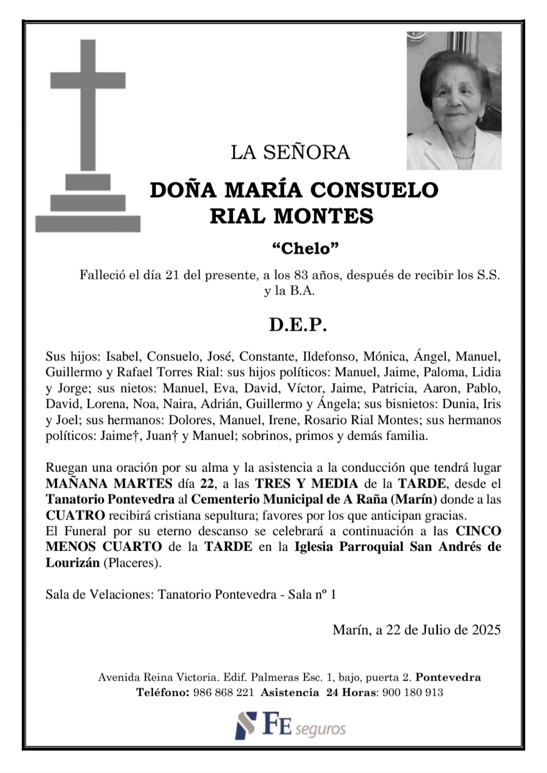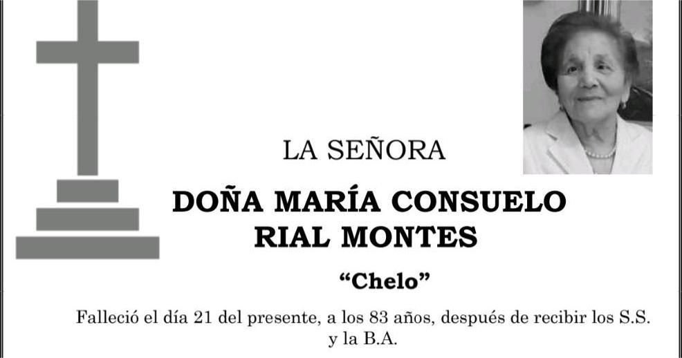La funeraria LA FE comunica el fallecimiento hoy, día 21 de julio, de doña MARÍA CONSUELO RIAL MONTES cuyos restos mortales permanecerán en el Tanatorio Pontevedra, sala nº 1, hasta el momento de su traslado, MAÑANA MARTES día 22 de julio, a las TRES Y MEDIA de la tarde, al cementerio municipal de A Raña (Marín) para su inhumación en cristiana sepultura, a las cuatro de la tarde