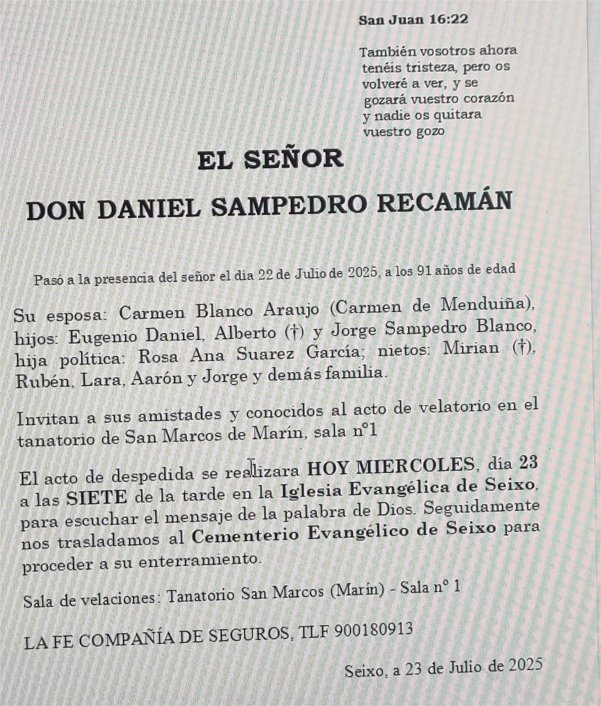La funeraria LA FE comunica el fallecimiento AYER, día 22 de julio, de don DANIEL SAMPEDRO RECAMÁN cuyos restos mortales permanecerán en el Tanatorio San Marcos de Marín, sala nº 1, hasta el momento de su traslado, hoy miércoles día 23 de julio, a las SIETE de la tarde, a la Iglesia Evengélica de Seixo para escuchar el mensaje de la palabra de Dios y, posteriormente, al cementerio Evangélico de Seixo para su enterramiento.