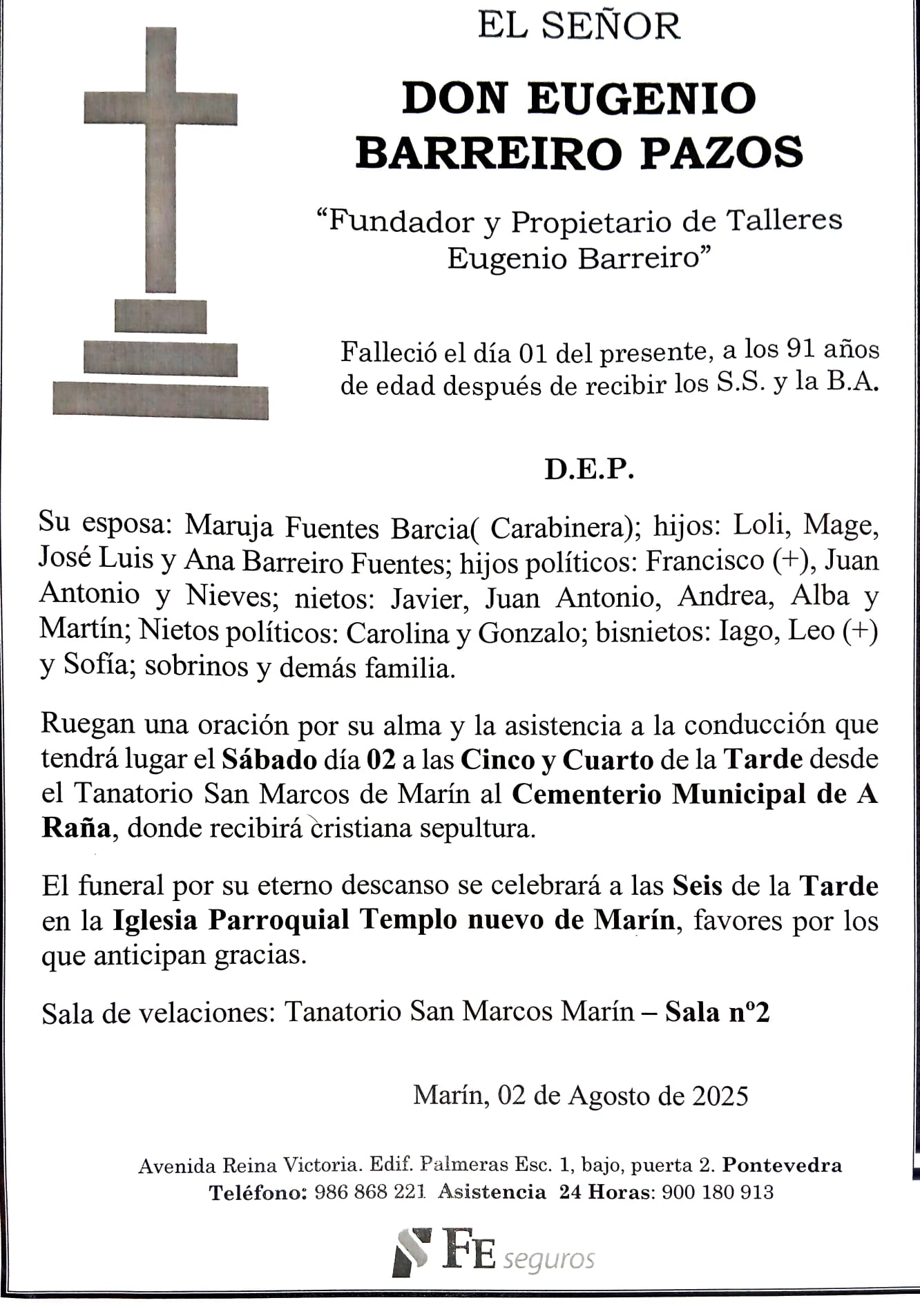La funeraria LA FE comunica el fallecimiento HOY, día 1 de agosto de don EUGENIO BARREIRO PAZOS cuyos restos mortales permanecerán en el Tanatorio San Marcos de Marín, sala nº 2, hasta el momento de su traslado, mañana SÁBADO día 2 de agosto, a las CINCO Y CUARTO de la tarde al Cementerio Municipal de A Raña para su inhumación