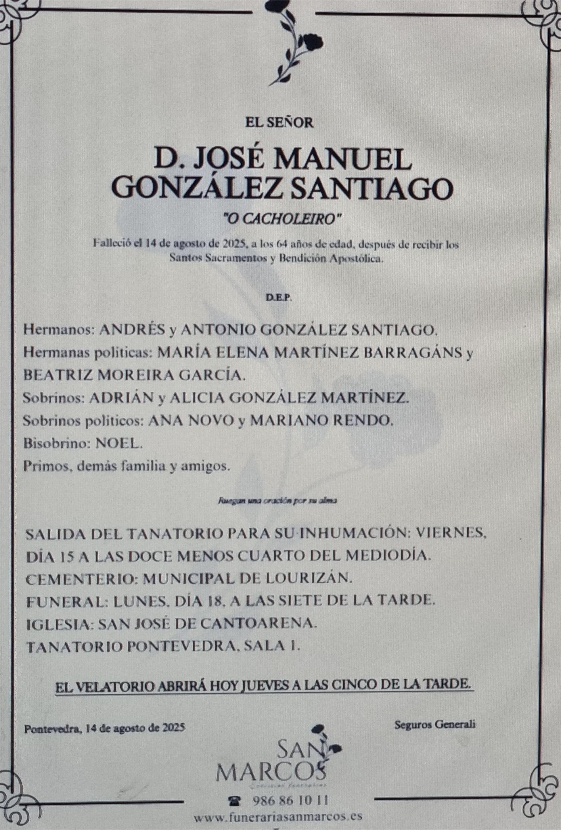 La funeraria SAN MARCOS comunica el fallecimiento HOY, día 14 de agosto de don JOSÉ MANUEL GONZÁLEZ SANTIAGO, cuyos restos mortales permanecerán en el Tanatorio San Marcos de Marín, sala nº 1 hasta el momento de su traslado, mañana VIERNES día 15 de agosto, a las DOCE MENOS CUARTO del mediodía para su inhumación en el cementerio municipal de Lourizán.