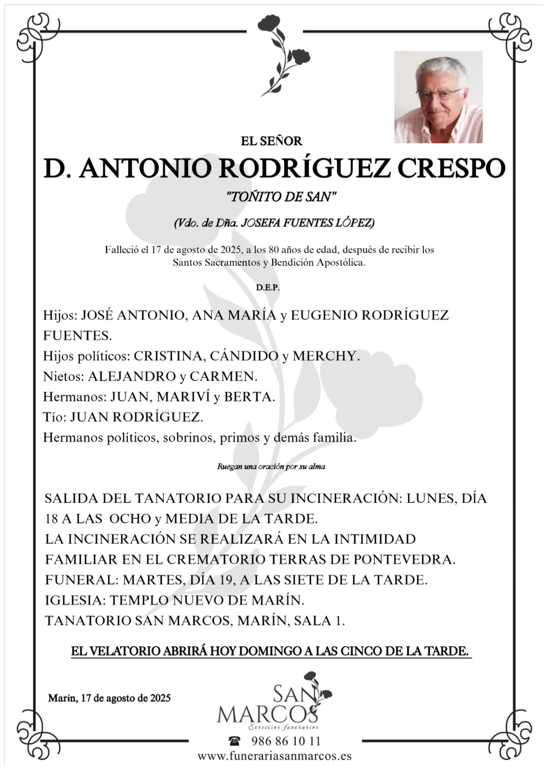La funeraria SAN MARCOS comunica el fallecimiento HOY, día 17 de agosto de don ANTONIO RODRÍGUEZ CRESPO cuyos restos mortales permanecerán en el Tanatorio San Marcos de Marín, sala nº 1, hasta el momento de su traslado, mañana lunes día 18 de agosto, a las OCHO Y MEDIA de la tarde para su incineración, en la intimidad familiar, en el crematorio Terras de Pontevedra