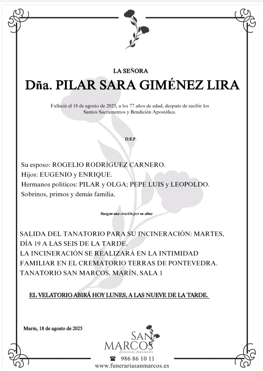 La funeraria SAN MARCOS comunica el fallecimiento HOY, día 18 de agosto de doña PILAR SARA GIMÉNEZ LIRA cuyos restos mortales permanecerán en el Tanatorio San Marcos de Marín, sala nº 1, hasta el momento de su traslado, mañana martes día 19 de agosto, a las SIETE de la tarde para su incineración, en la intimidad familiar, en el crematorio Terras de Pontevedra