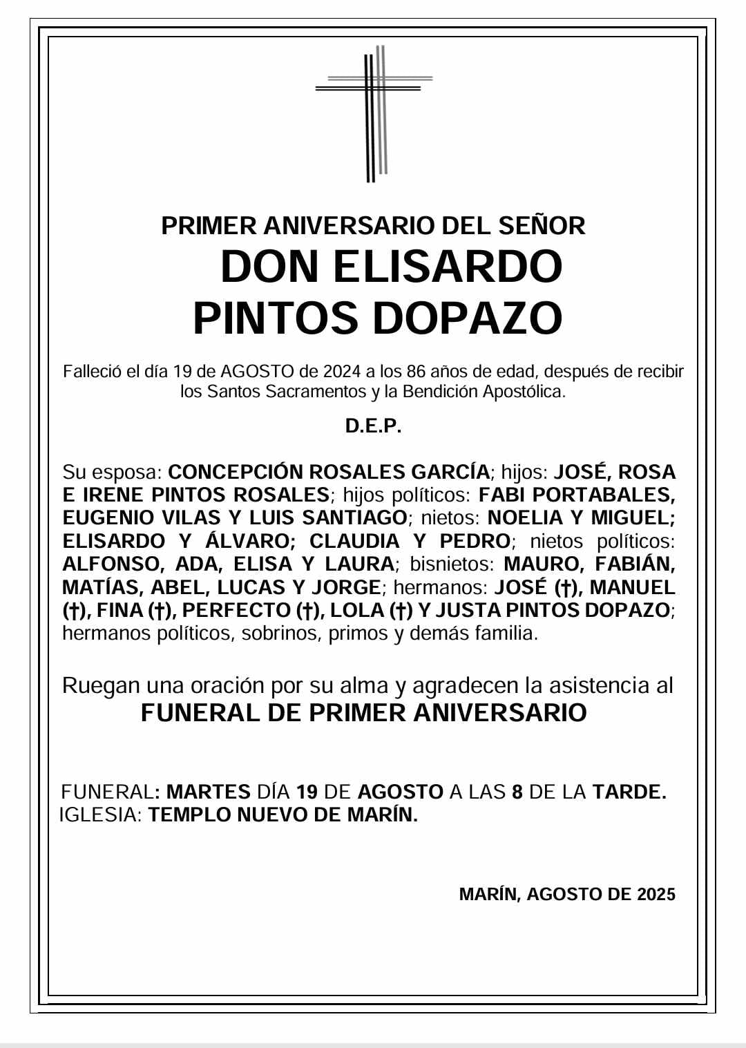 La familia de Don Elisardo Pintos Dopazo comunica que, hoy día 19, se cumple un año su fallecimiento a los 86 años de edad y, en su recuerdo y por su alma, tendrá lugar el funeral de primer aniversario en la iglesia parroquial de Marín, templo nuevo, hoy día 19, a las ocho de la tarde.