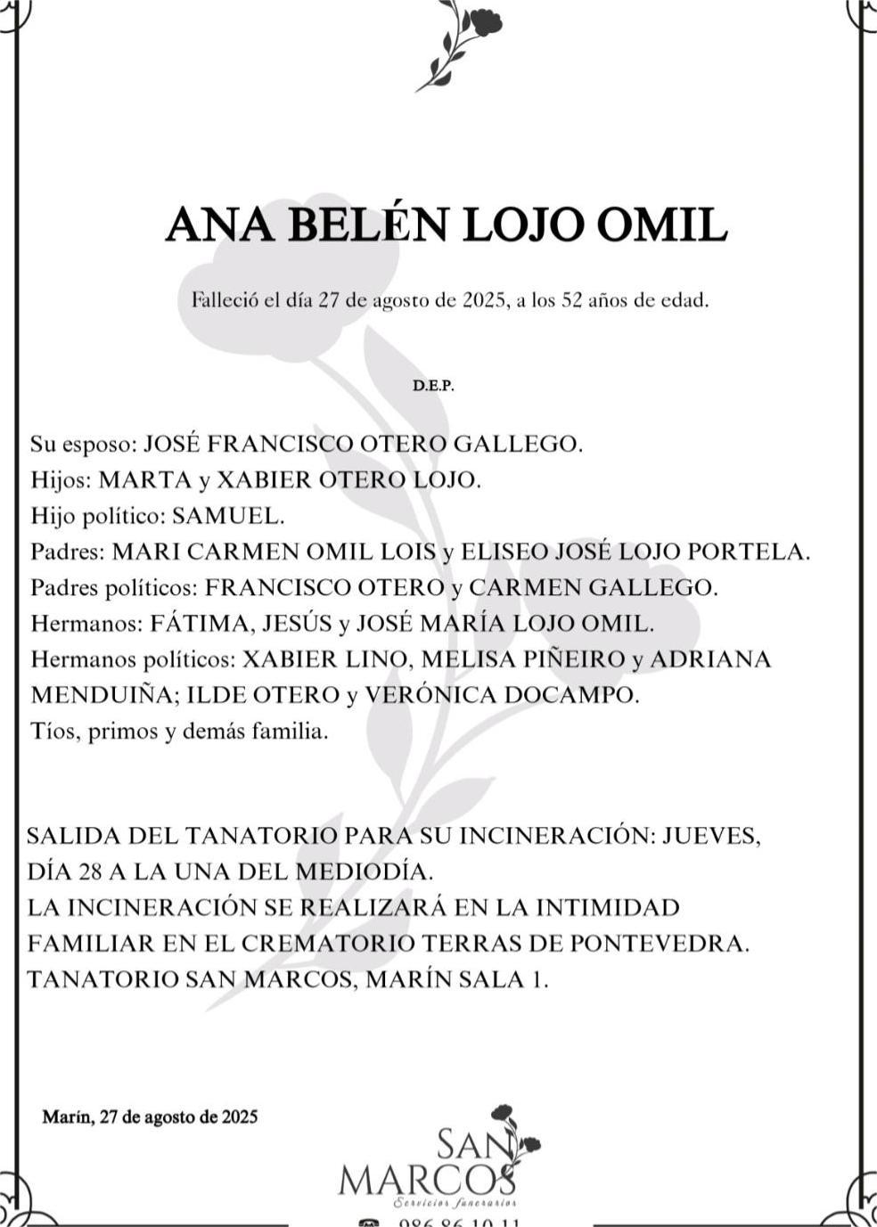 La funeraria SAN MARCOS comunica el fallecimiento de doña ANA BELÉN LOJO OMIL, cuyos restos mortales permanecerán en su tanatorio de Marín, sala número 1, hasta el momento de su traslado, mañana JUEVES día 28 a la UNA DEL MEDIODÍA para su incineración en la intimidad familiar, en el crematorio “Terras de Pontevedra” .DEP.