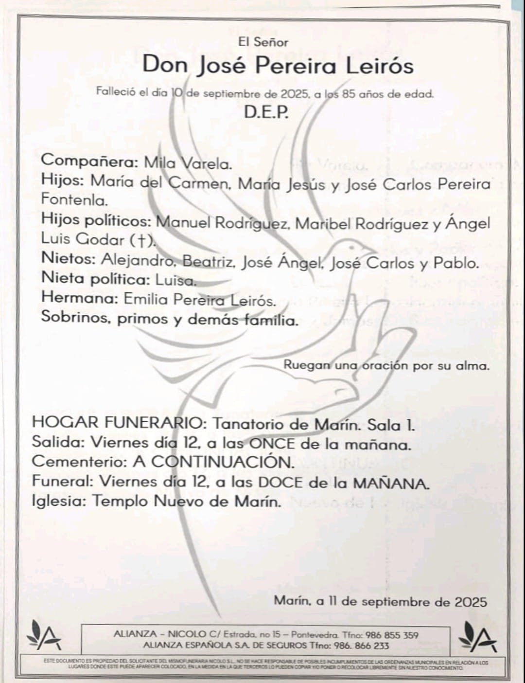 Según comunica la compañía “ALIANZA ESPAÑOLA” , mañana viernes día 12 recibirán cristiana sepultura los restos mortales de DON JOSÉ PEREIRA LEIRÓS, la persona fallecida a consecuencia del accidente doméstico de la explosión de gas ocurrida el pasado martes en la calle Méndez Núñez de Marín.