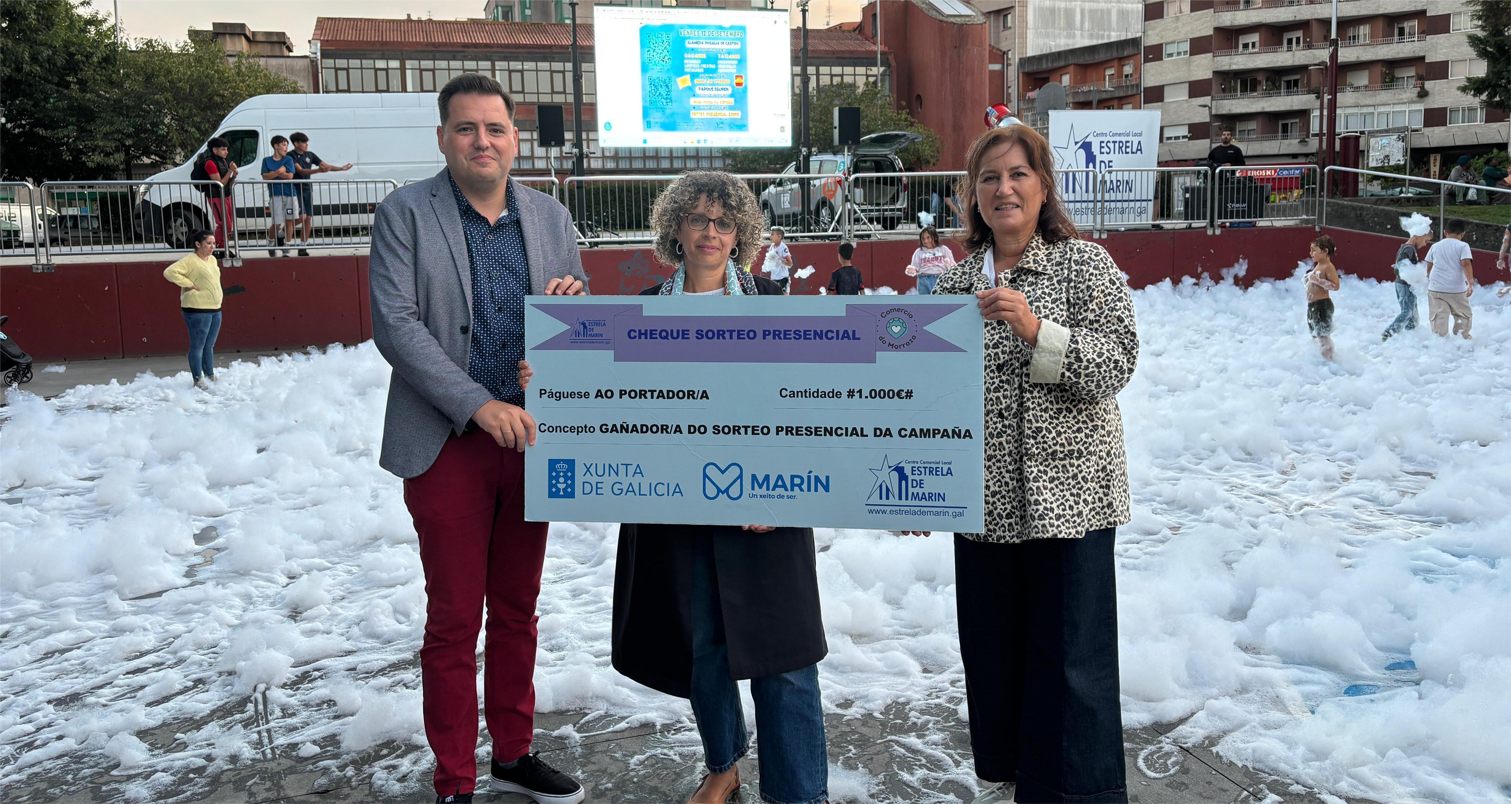 Pilar Suárez Boullosa que recogió el premio de manos del gerente de “Estrela de Marín” y la concejala de comercio Cristina Acuña.