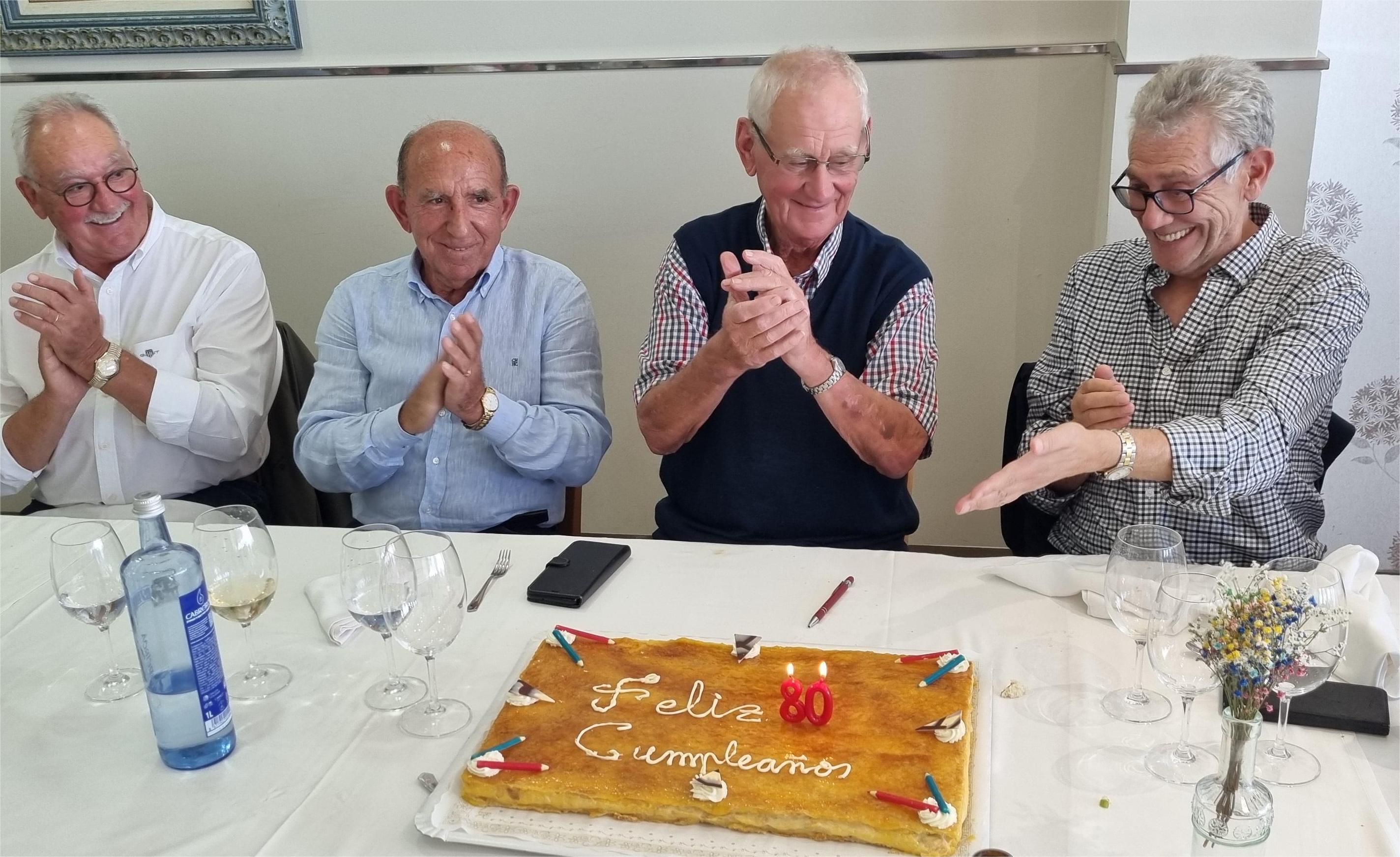 “Feliz en tu día” ante la gran tarta con una vela representeativa de sus 80 años. Estaban entre los asistentes, Claudino González, presidente de los armadores de Marín; Javier Touza, de la Cooperativa de Armadores de Vigo y Daniel Castro, presidente de la Organización de Productores nº4.