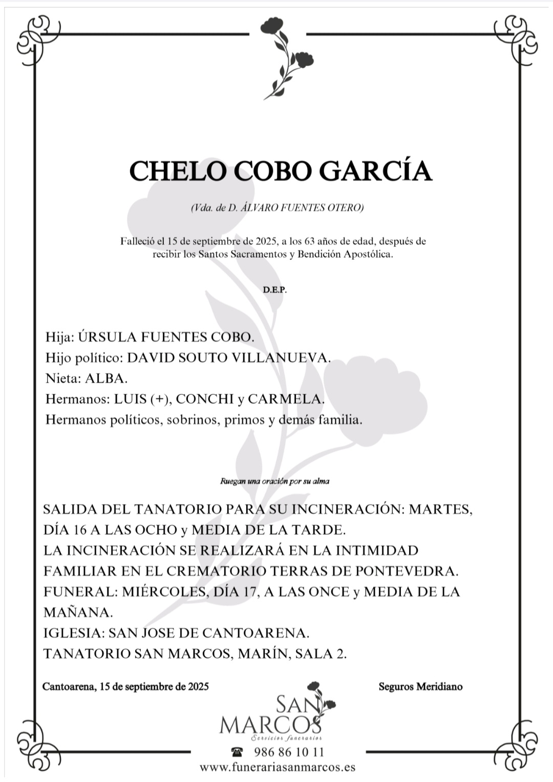 La funeraria SAN MARCOS comunica el fallecimiento de CHELO COBO GARCÍA, cuyos restos mortales permanecerán en el tanatorio San Marcos de Marín, sala número 2, hasta el momento de su traslado, mañana MARTES día 16, a las OCHO Y MEDIA de la tarde al crematorio Terras de Pontevedra para su incineración en la intimidad familiar