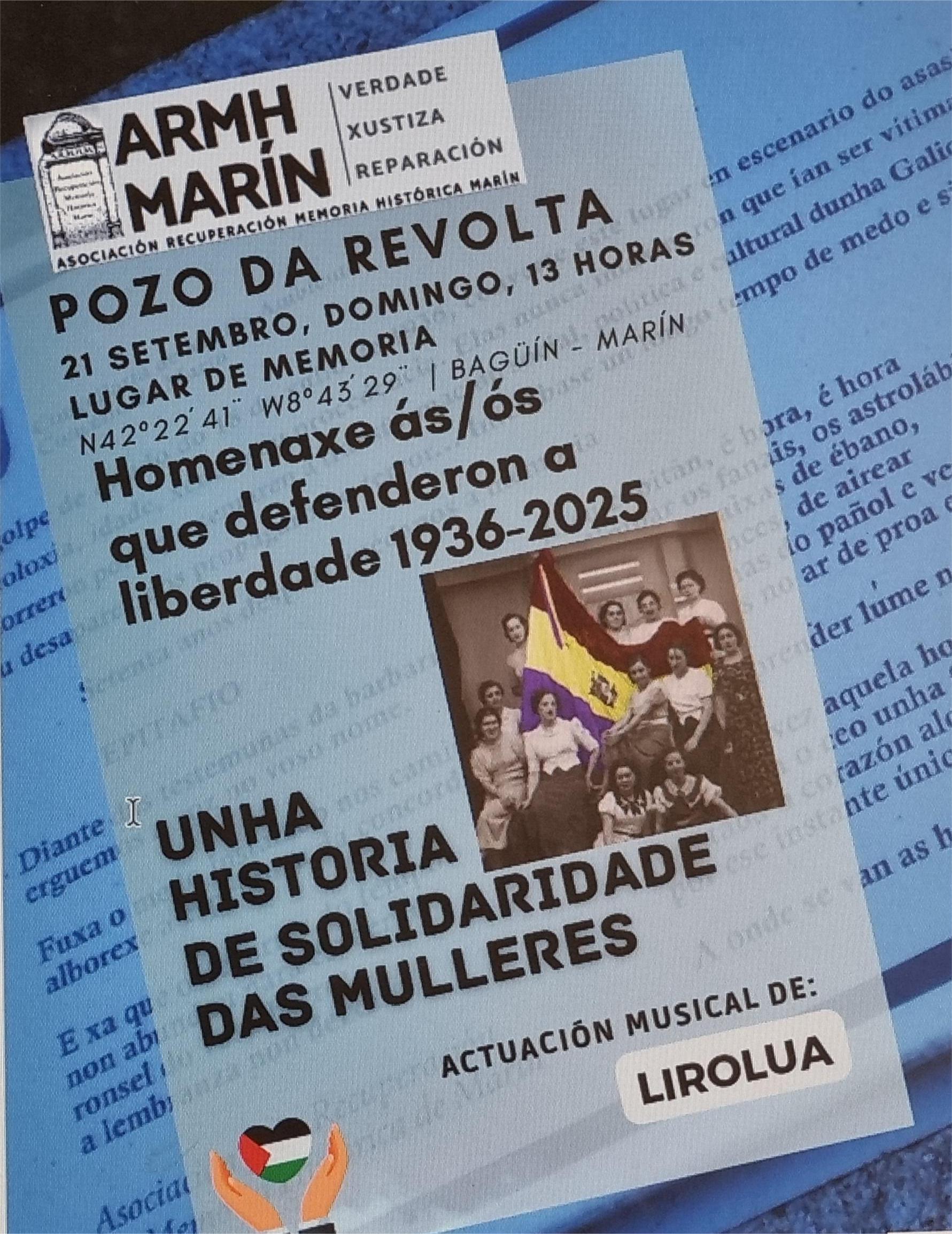Como cada año en el mes de septiembre y en torno a la fecha en que fue asesinada Carmen Area “A Capirota" en el por aquella época, lúgubre “Pozo da Revolta” en Bagüín, la “Asociación para la Recuperación da Memoria Histórica” que lidera Queta Otero, “Molas”, organiza mañana domingo día 20 el homenaje de recuerdo “Ás persoas que defenderon a Liberdade” recordando también el triste episodio del asesinato de “A Capirota” en ese mismo punto junto con otra persona que salvó la vida haciéndose pasar por muerta y a pesar de las tremendas heridas que le provocó el fallido fusilamiento en su caso.