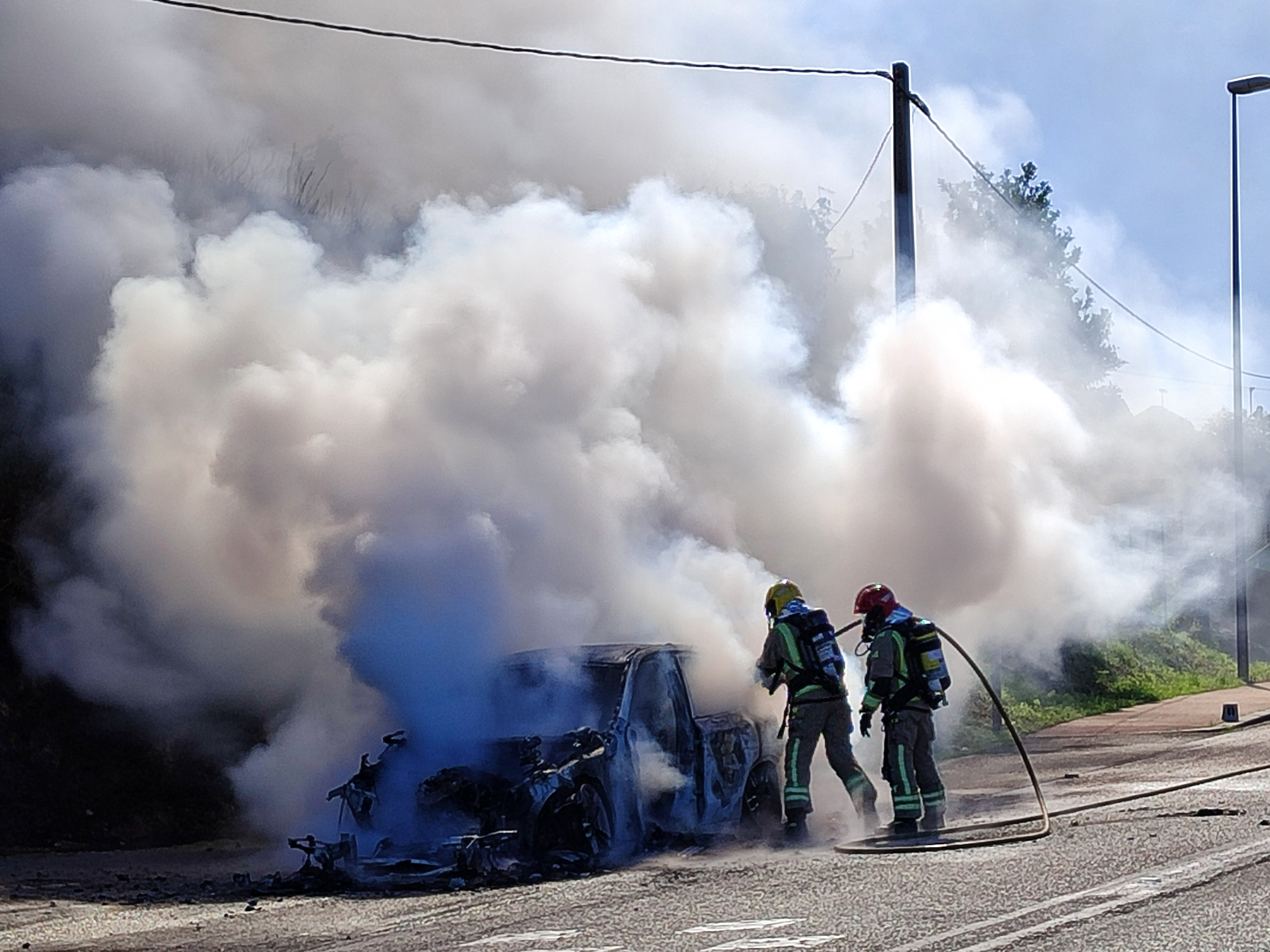 El incendio de un vehículo este mediodía en la PO313 provocó el corte de la carretera hasta que el fuego fue controlado por los Bomberos de O Morrazo.