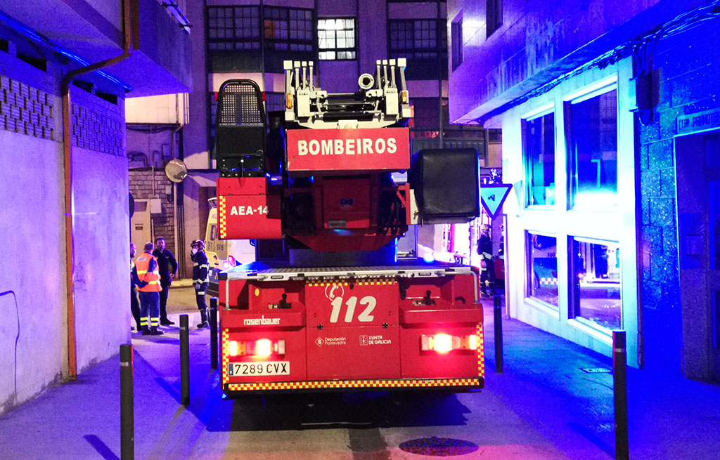 Los bomberos acudieron, aunque finalmente no utilizaron su camión grúa para entrar por el exterior en el piso, en una planta tres.