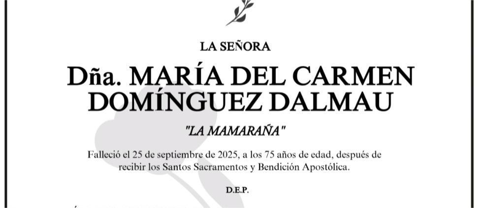 La funeraria SAN MARCOS comunica el fallecimiento de Doña MARÍA DEL CARMEN DOMÍNGUEZ DALMAU, cuyos restos mortales permanecerán en el tanatorio ...