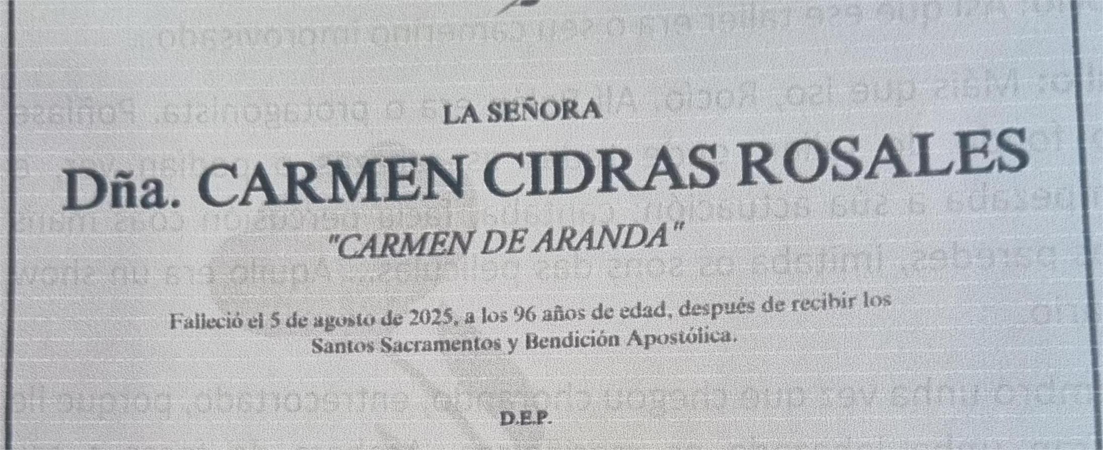 La funeraria SAN MARCOS comunica el fallecimiento HOY, día 5 de agosto de doña CARMEN CIDRÁS ROSALES, cuyos restos mortales permanecerán en ...