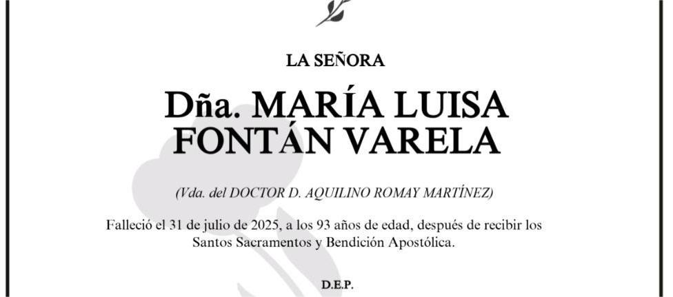 La funeraria SAN MARCOS comunica el fallecimiento HOY, día 31 de julio, de doña MARÍA LUISA FONTÁN VARELA cuyos restos mortales permanecerán ...
