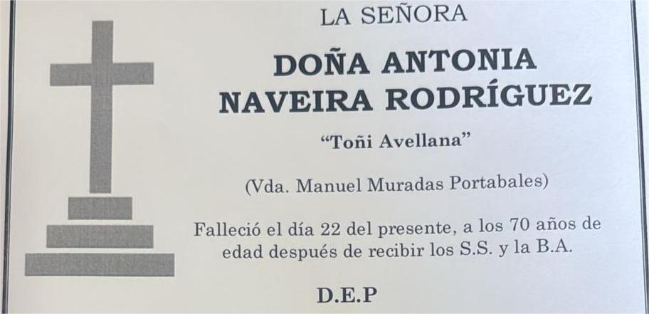 La funeraria LA FE comunica el fallecimiento hoy, día 22 de julio, de doña ANTONIA NAVEIRA RODRÍGUEZ cuyos restos mortales permanecerán en el ...