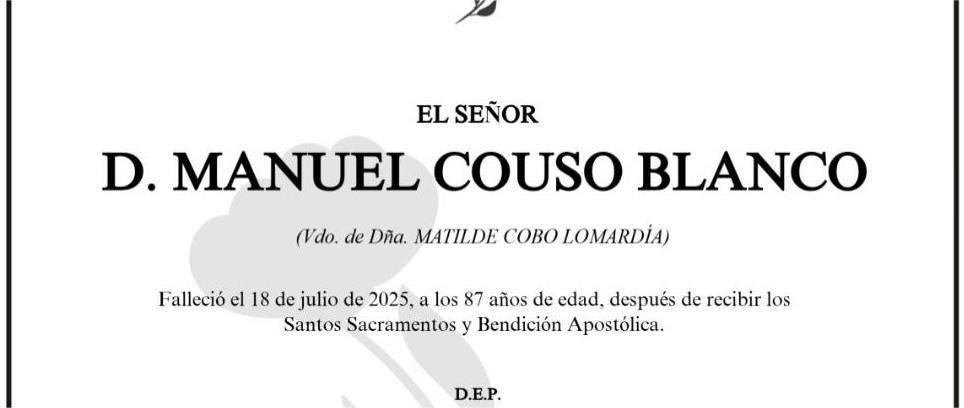 La funeraria SAN MARCOS comunica el fallecimiento hoy, día 18 de julio, de don MANUEL COUSO BLANCO cuyos restos mortales permanecerán en el ...