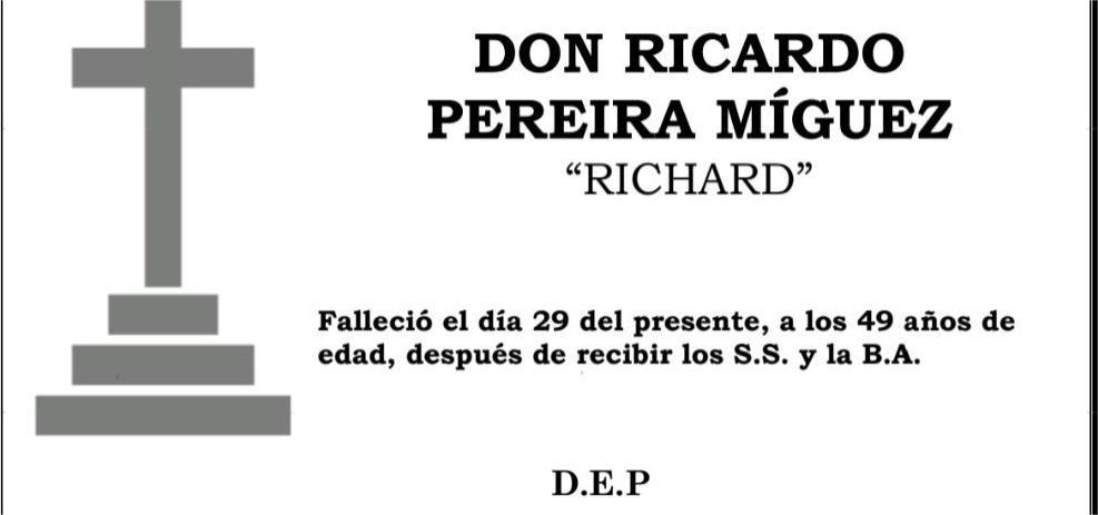 La funeraria LA FE comunica el fallecimiento HOY día 29, a los 49 años de edad de RICARDO PEREIRA MÍGUEZ cuyos restos mortales permanecerán en ...